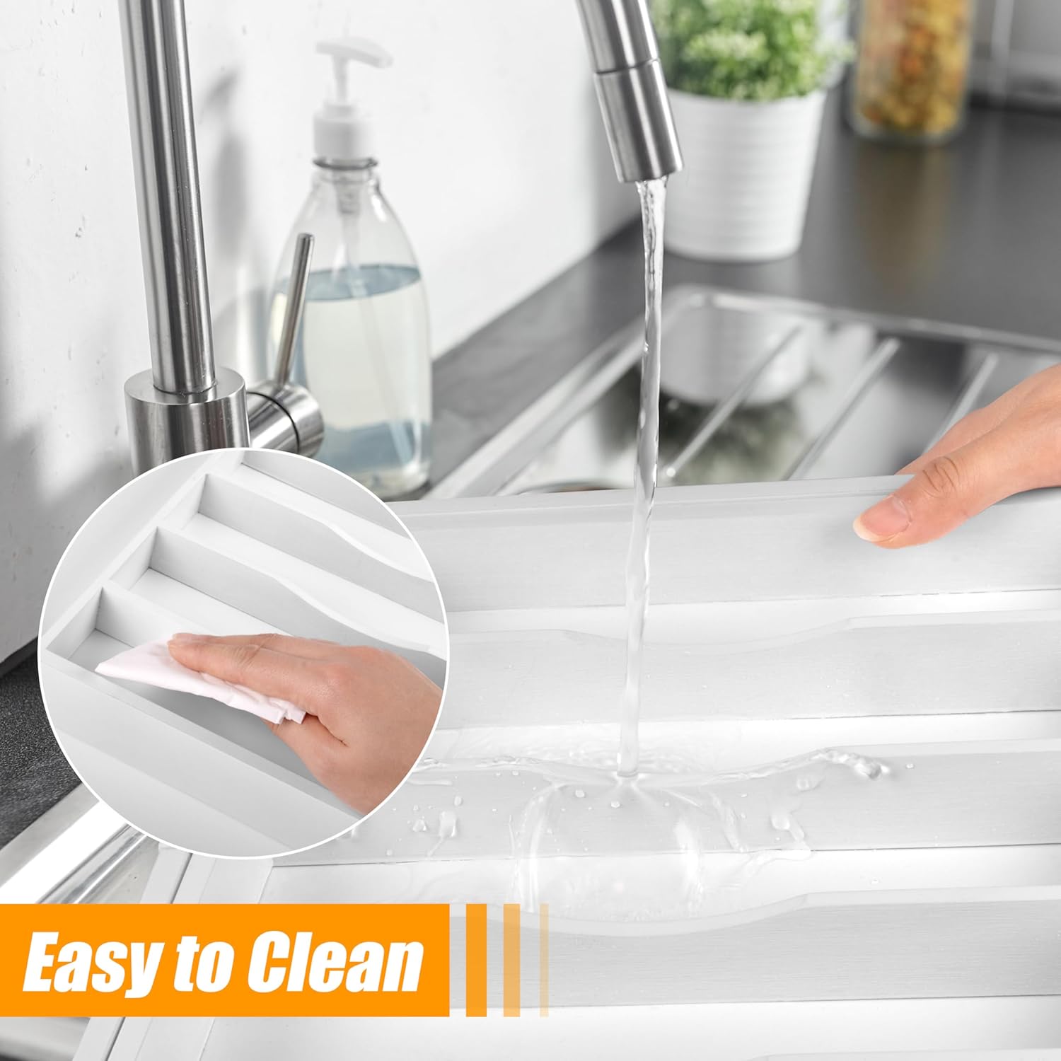 - â ăHelper - Keep Your Home TidyăSay goodbye to cluttered junk drawers and the hassle of searching for kitchen utensils. No more digging through drawers filled with silverware and miscellaneous items. Our utensil silverware drawer organizer can help you stay organized, providing a designated spot for each item, ensuring everything is in its place and easily accessible. Different-sized compartments accommodate standard utensils and larger dinnerware. And maintain an overall tidy and clean appearance.