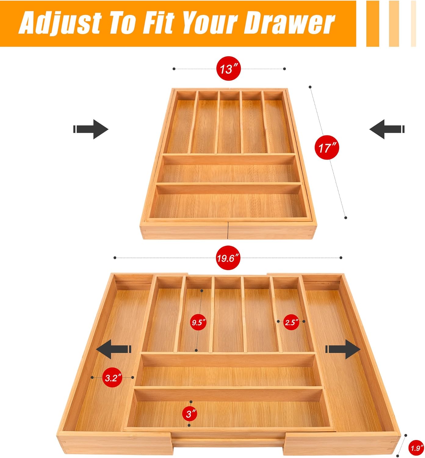 - â ăExpandable - fit most kitchen drawers.ăOur large utensil silverware drawer organizer flatware cutlery tray are adjustable in width, expanding from 17"x13" to 17"x19.6" as needed, with a depth of 1.9" . The utensil silverware drawer organizer is crafted from natural bamboo that has been grown for over 4 years. Each silverware drawer organizer made of bamboo is meticulously handcrafted by seasoned artisans to ensure a smooth, smooth surface. You can confidently allow your family or children to use our silverware drawer organizer.