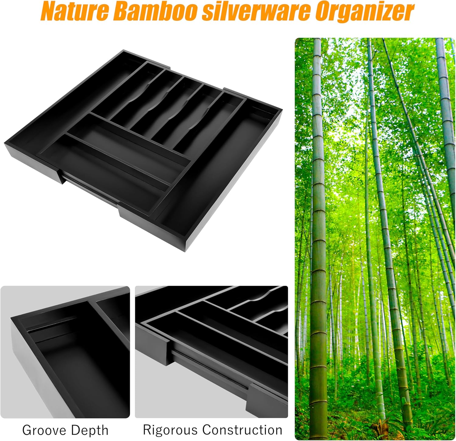 Bellsal Large Premium Bamboo Silverware Organizer - Expandable Utensil Drawer Organizer - 17"x19.6" Utensil Holder and Cutlery Tray with Grooved for Kitchen Flatware and Utensils(7-9 Slot, Black)