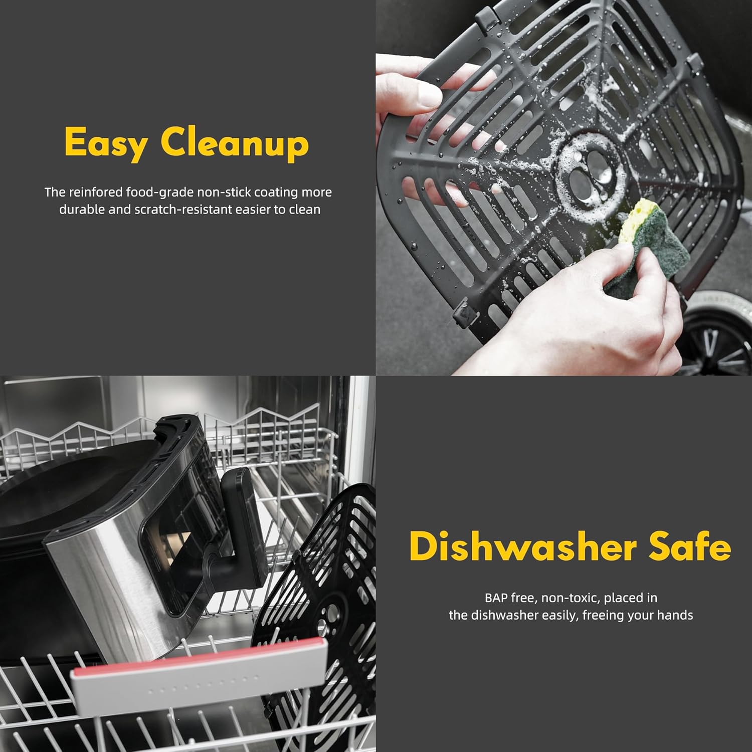 - 【Effortless Cleaning & Hassle-Free Maintenance】Enjoy stress-free cleanup with our 8.5QT Air Fryer. Featuring premium nonstick, BPA-free accessories, the dishwasher-safe basket and tray make maintenance a breeze. The smooth, fingerprint-resistant exterior wipes clean effortlessly, saving you time and effort. Perfect for busy homes, this air fryer combines easy cleaning, safety, and functionality for a hassle-free cooking experience.