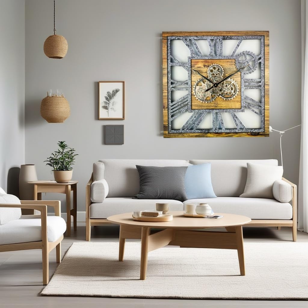 The Gears Clock 24'' Inch Square Real Moving Gear Wall Clock Vintage Industrial Oversized Rustic Farmhouse (Wood and Stone)