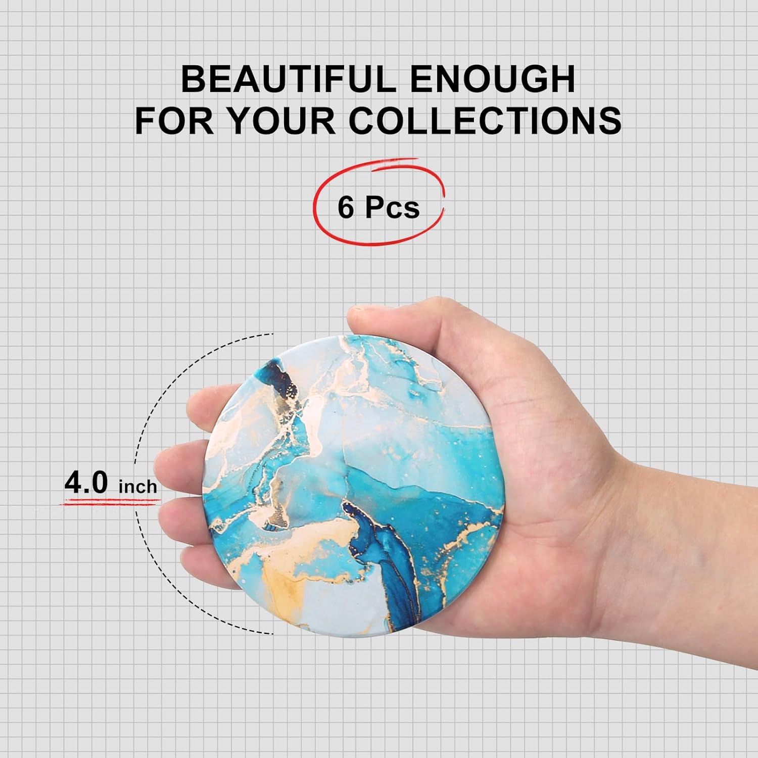 - Coasters with Metal Holder Set: 6 pcs 4" Round ceramic coasters and a 4.5" gold metal coaster holder.