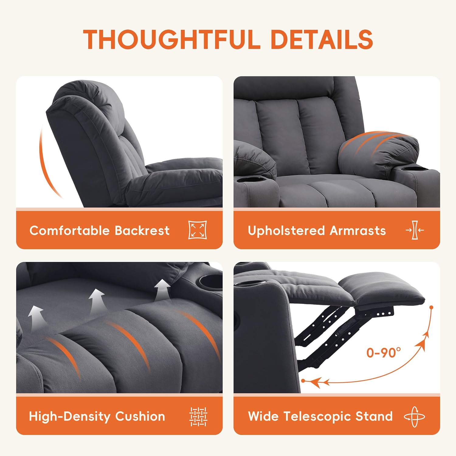 - EASY TO ASSEMBLE: This chair for bedroom with will only take within 5 minutes from assemble to use the chairs. Just enjoy your reading, music, napping time and fully relax your body and mood with this comfortable massage recliner.If any problem with our sofa chair, you can also contact our service to help you.