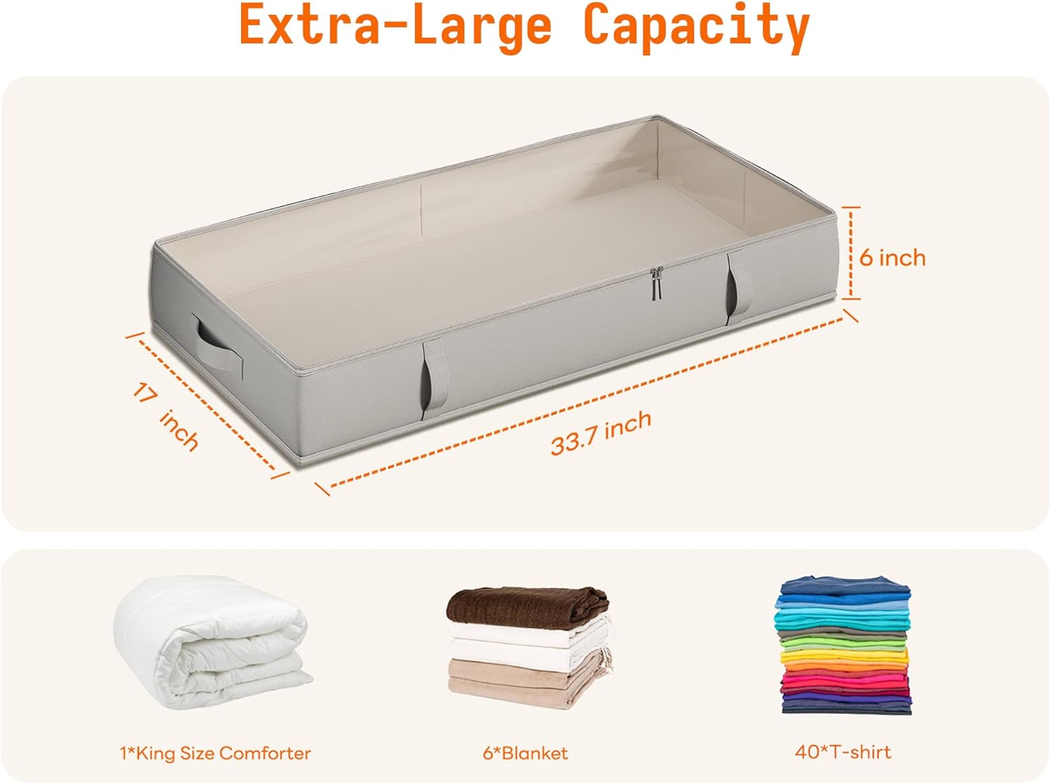 - 【High-end Fabric & Large Capacity】Crafted from high-end, durable fabric, our under bed storage bags measure 33.7"L x 17.1"W x 6"H inches each, offering generous space for your essentials. These containers are your ultimate solution for storing bulky items like seasonal clothing, comforters, and blankets, combining spaciousness with a sophisticated gray design