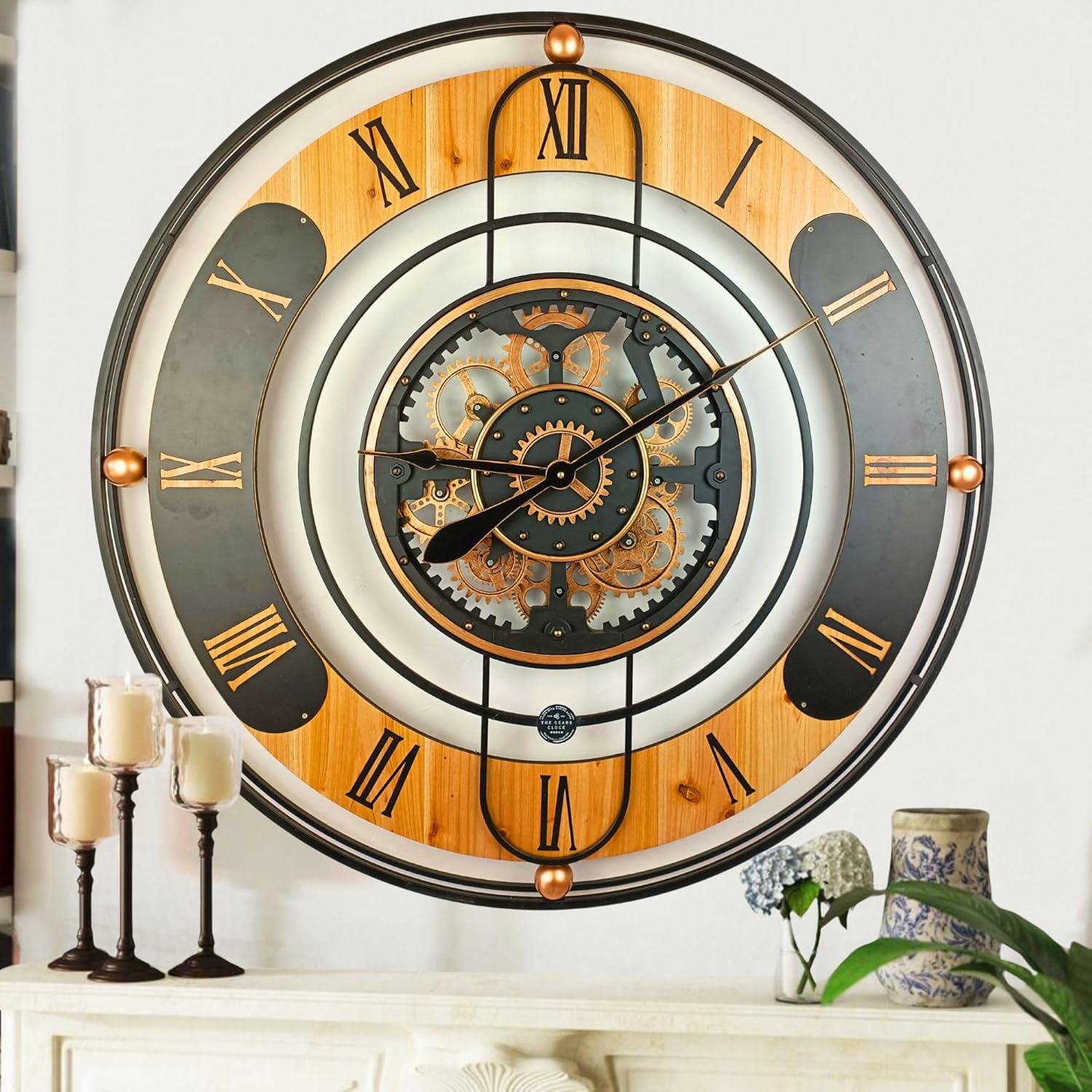 - MATERIAL QUALITY | The entire frame is made of Metal and Fir Wood, and high Quality Plastic gears for vintage and industrial effect. The Gears has no background on this clock for a beautiful naked appereance. Very Strong personality.