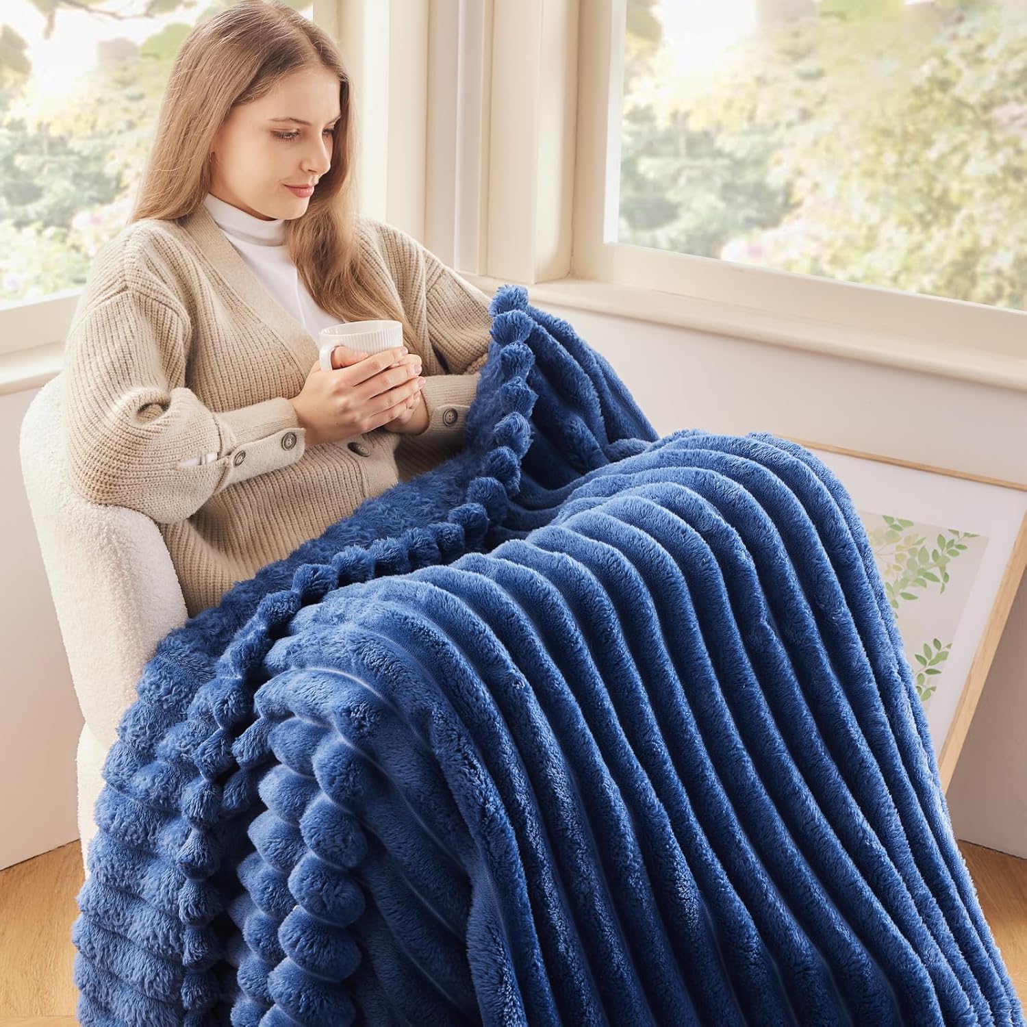 NEWCOSPLAY Super Soft Twin Blanket Navy Premium Silky Flannel Fleece 3D Ribbed Jacquard Lightweight Bed Blanket All Season Use (Navy Ribbed, Twin(60"x80"))