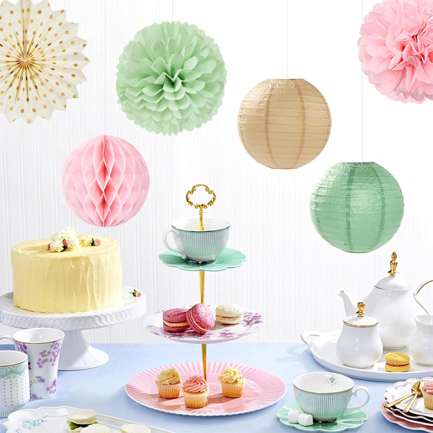 • 【Package Contains】The sage green pink beige champagne party kits include 6pcs tissue paper flowers: 3pcs 10" and 3pcs 12" in three color, 2pcs 8inch paper honeycom ball,4pcs 8inch paper lantern, 2pcs 12inch paper fan.