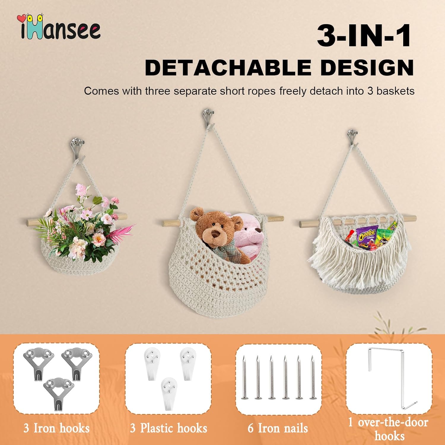 - ăEasy to Installă Installation is a breeze, requiring just three simple steps and no assembly. Just hammer/nail, hang, and done! Equipped with 1 over the door hook, 3 hidden hooks, 3 metal hook and 6 metal screws(drill holes for installation). These hanging baskets for organizing make excellent gifts for birthdays, holidays, and housewarmings.