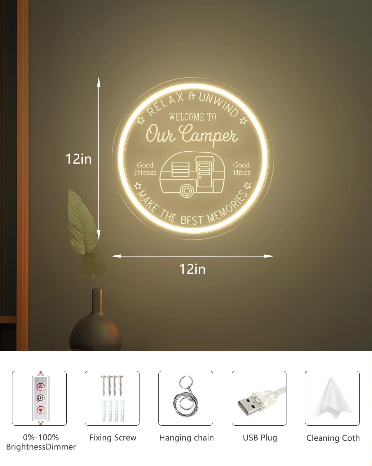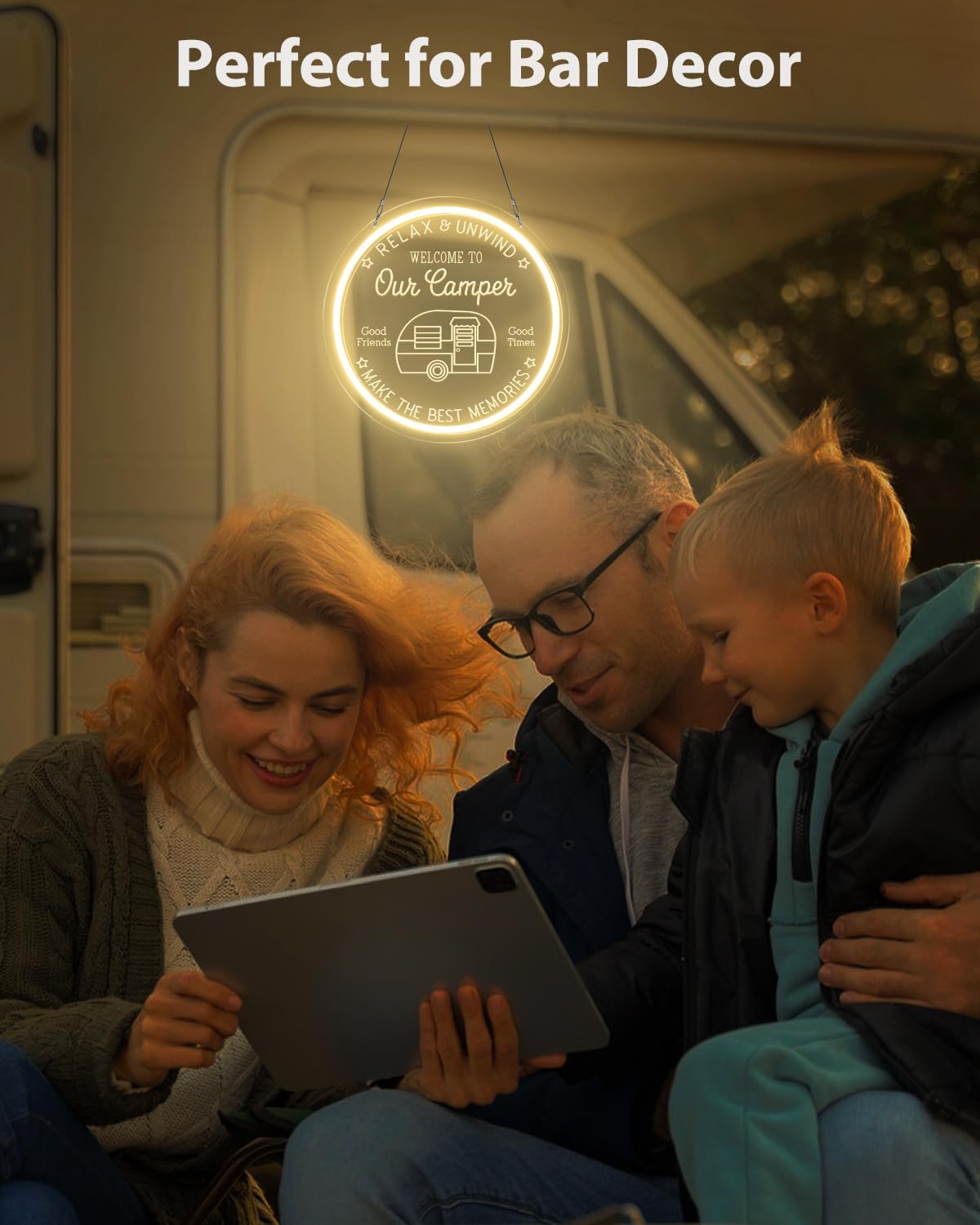 - 🍾【Perfect Wall Decor】Use this camper neon sign in your party to create a unique atmosphere and make a wonderful addition. It's a really nice mood light and it definitely adds flavor to an otherwise plain space. This led sign can also be used to decorate many scenes, such as garage, back yard, patio, poolside, bedroom, home pub, game room, man cave, BBQ party and so on.