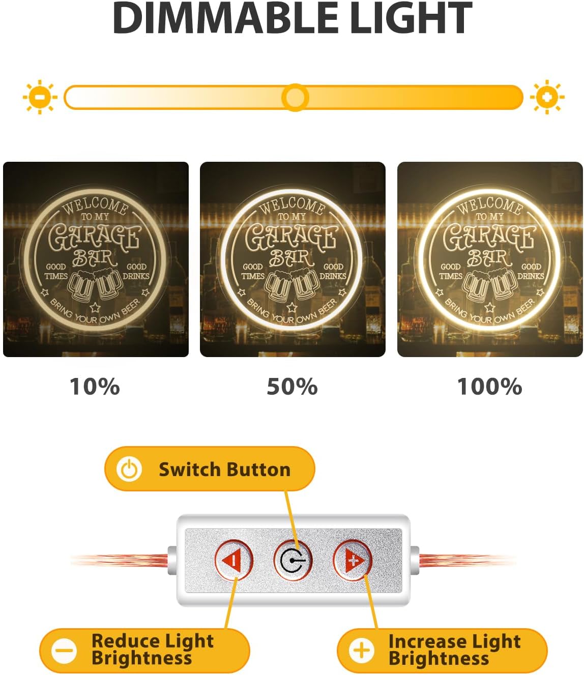 - ✨【10-Level Dimmable】Customize your led signs experience with our 10-level dimmable feature! Adjust the brightness of your neon sign to match your mood or ambiance. Whether you want a subtle glow or a bright, vibrant display, you can easily adjust it to your preference with our easy-to-use dimming controls.