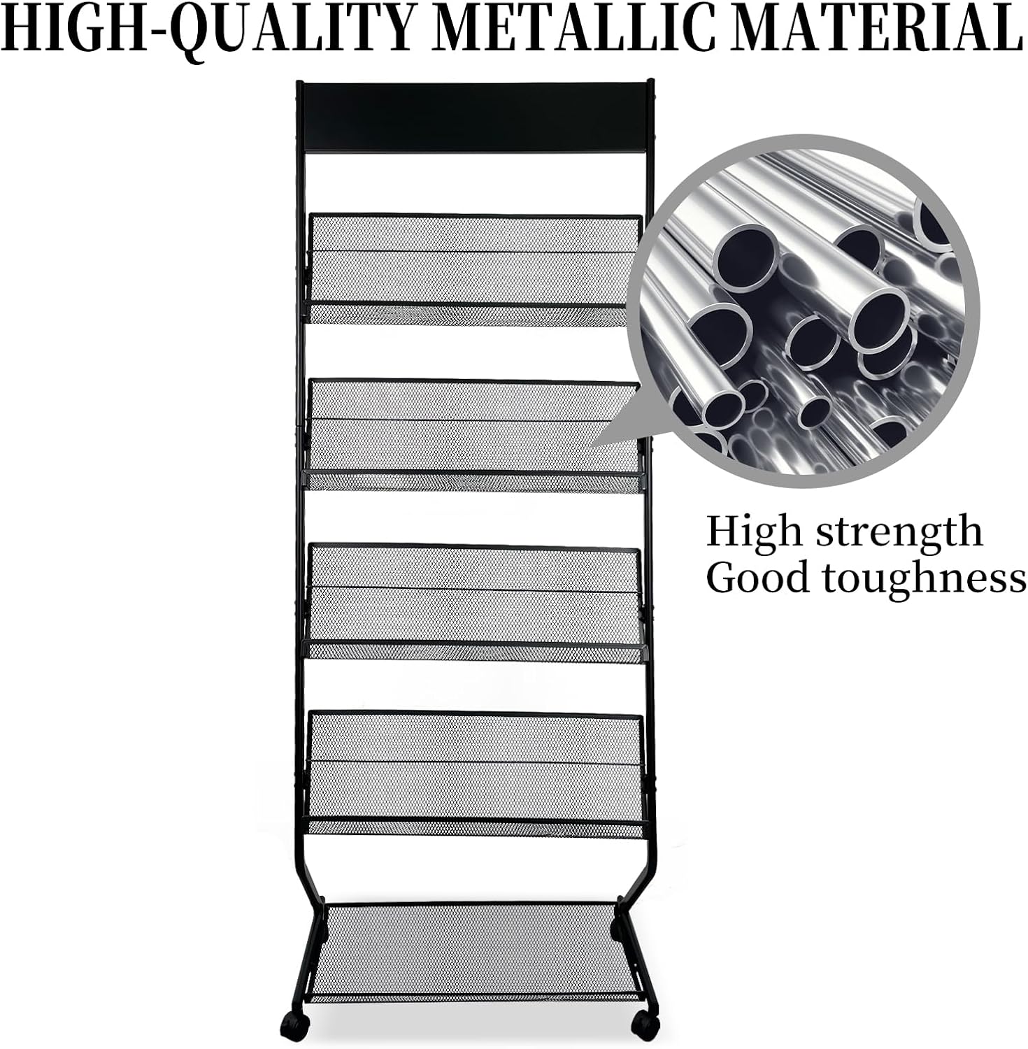 Tongmo Floor-Standing Magazine Rack 4-Layer with Wheels, Brochure Display Stand, High-hardness metal for Office,Exhibitions, and Any Organization Requiring Information Display (black)