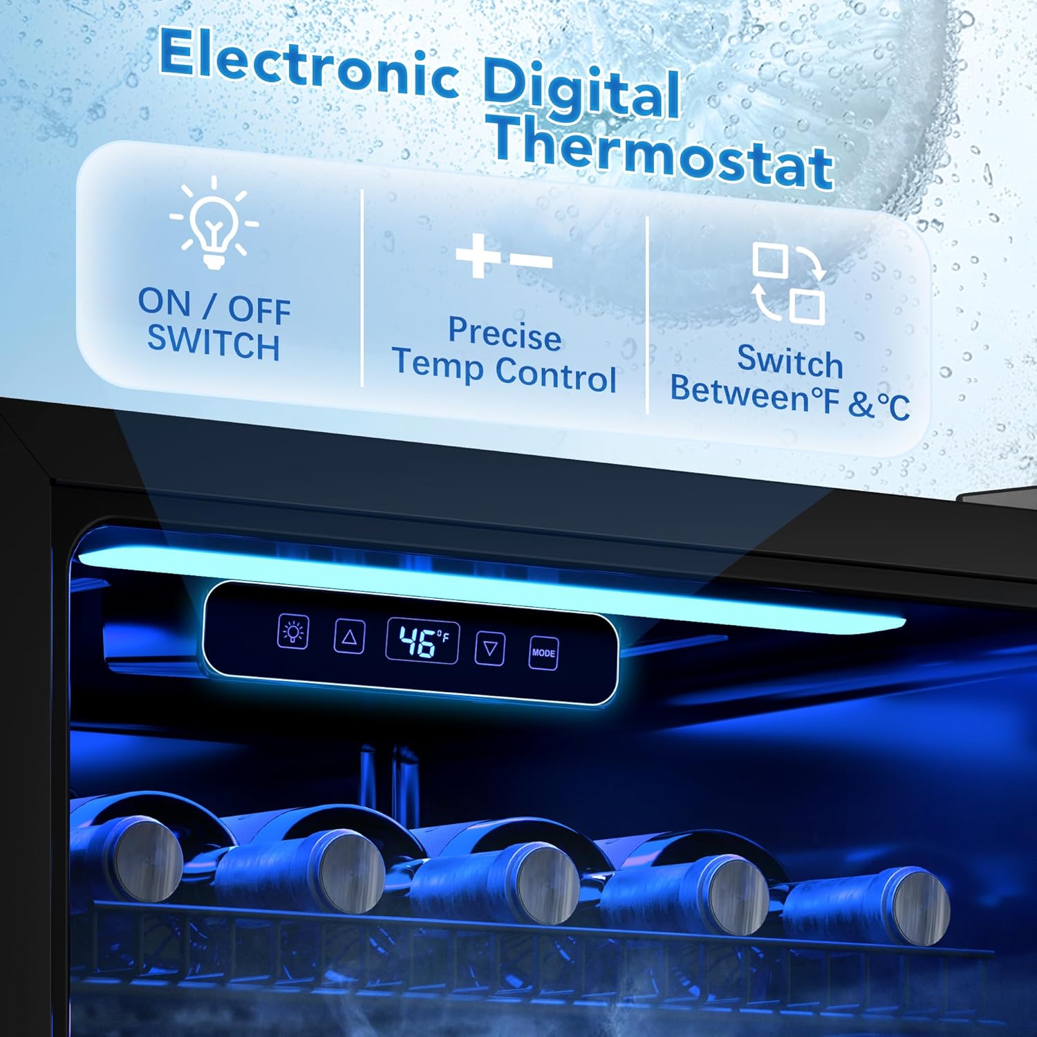 - [Simple & Intelligent Control System] Our Beverage Refrigerator features a user-friendly touch panel that allows for easy temperature adjustment. With a temperature range of 35-65°F (2-18°C), you can easily customize the temperature to your liking (55°F is often cited as close to perfect). To accommodate your usage preferences, we have also added a MODE button. This allows you to toggle between Fahrenheit and Celsius temperatures.There's also an LED light that comes on at the touch of a button.