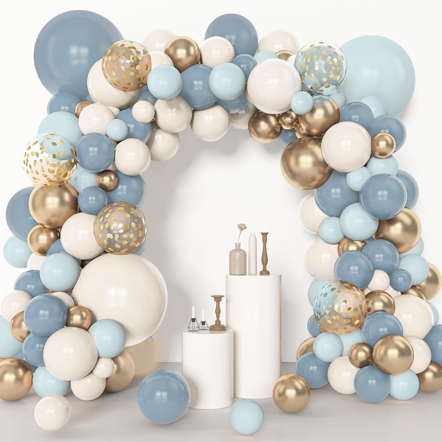 Amandir 153pcs Dusty Blue Balloon Garland Arch Kit, Different Sizes 18 12 10 5 inch Blue White Sand Latex Metallic Confetti Gold Balloons for Boys Birthday Boho Baby Shower Party Decoration Supplies