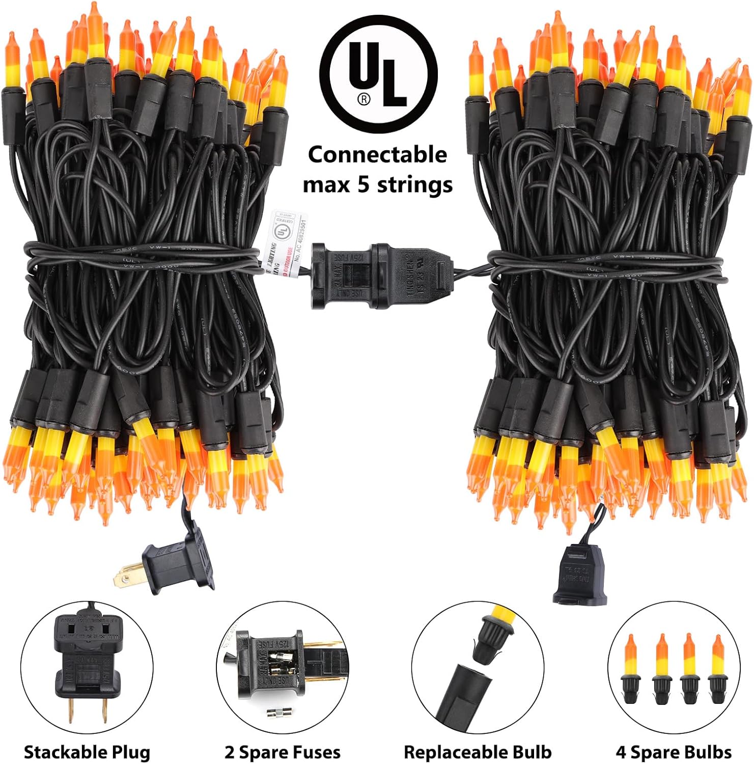- End-to-End Connectable & Easy to Install: Each Halloween string light features a male and a female safe plug, an easy end-to-end connection allows up to 5 strands (125ft in total) connected together to illuminate a wider range. Just hang the string light on wherever you like, power on, you will get a charming night with these bright lights!