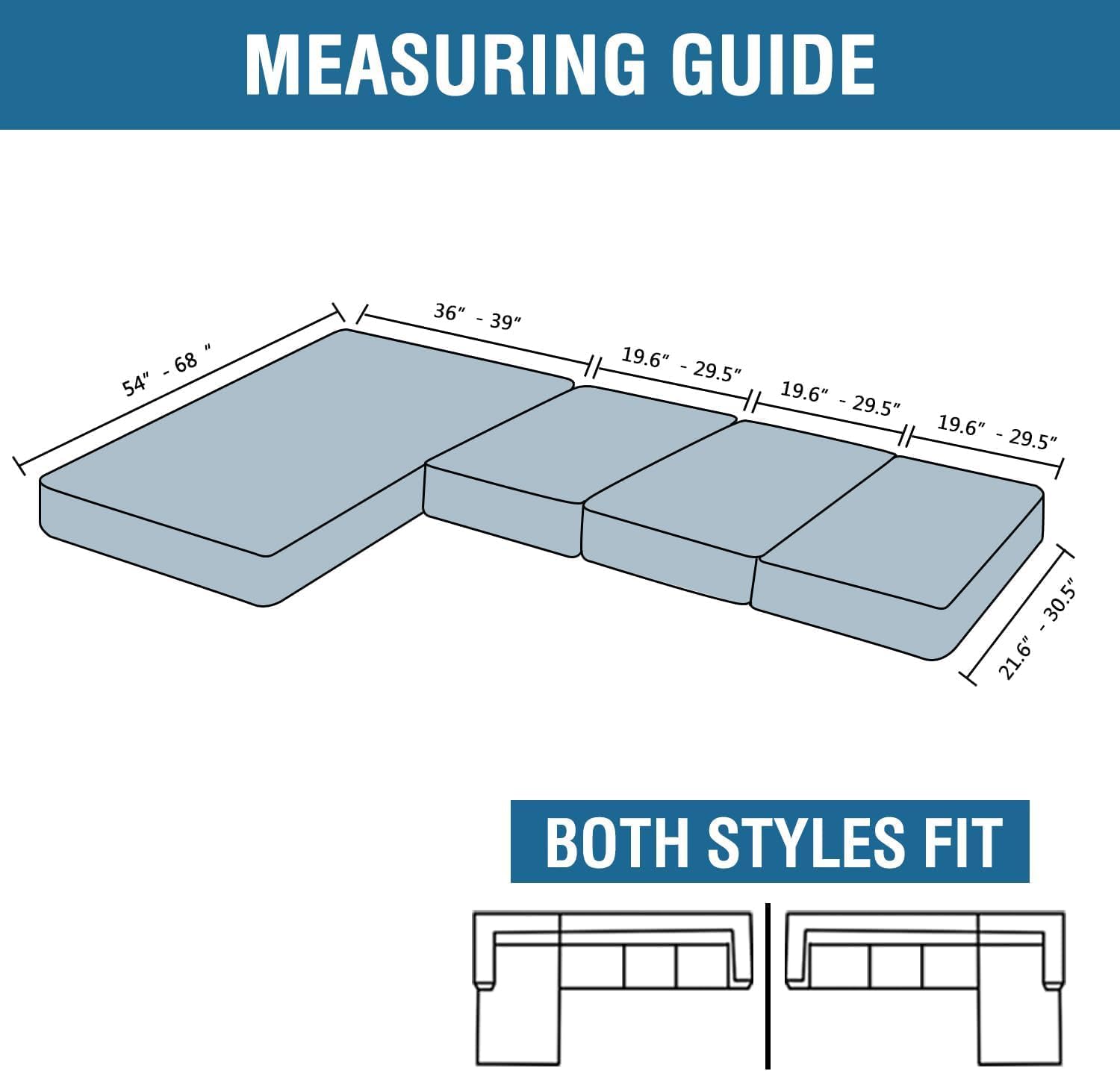 - UPGRADED THICKER: Each individual cushion cover fits up to 19.6-29 inch width, 21.6-30.5 inch depth, 3-8 inch thickness while the chaise cover fits up to 32-38 inch width, 54-62 inch depth, 3-8 inch thickness. Feature one-size-fits-most, kindly measure before ordering