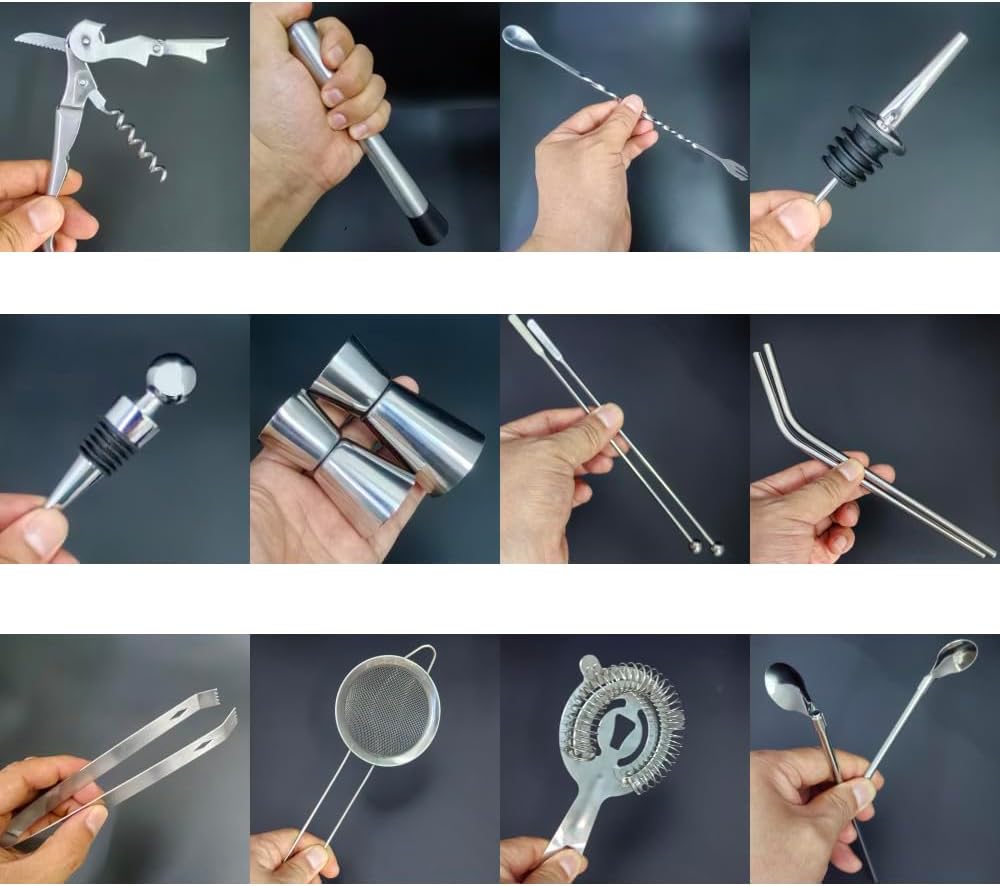 - Included Components : 22-Piece Bartender Tool Kit Includes:1*25/20 oz Shaker Cup,1*25/50ml Jigger,1*15/30ml Jigger,1*ice Strainer, 1*colander, 1*ice tongs, 1*muddler, 1*fork&spoon, 1*corkscrew, 2*mixing rod, 2*straw spoon, 2*curved straw, 4*pourer, 2*wine stopper, 1*Recipes Booklet, 1*black arylic stand. 22-Piece Bartender Tool Kit Includes:1*25/20 oz Shaker Cup,1*25/50ml Jigger,1*15/30ml Jigger,1*ice Strainer, 1*colander, 1*ice tongs,… See more