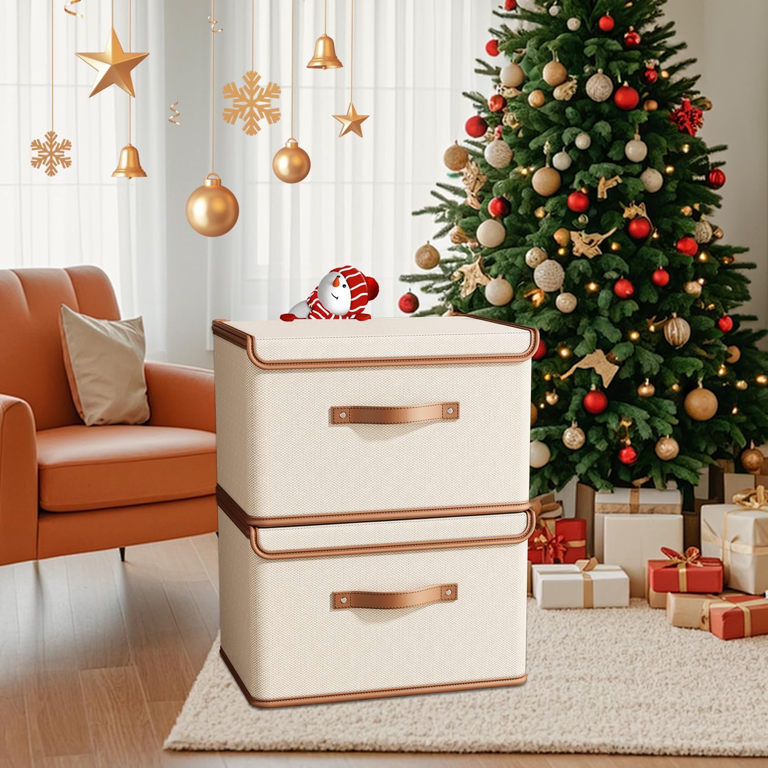 Tuza 2 Pack Storage Bins with Lids, Collapsible Closet Organizer Container, Fabric Organizer Box with Handles, Decorative Storage Boxes with Lids for Organizing Clothes, Books, File, White, Medium