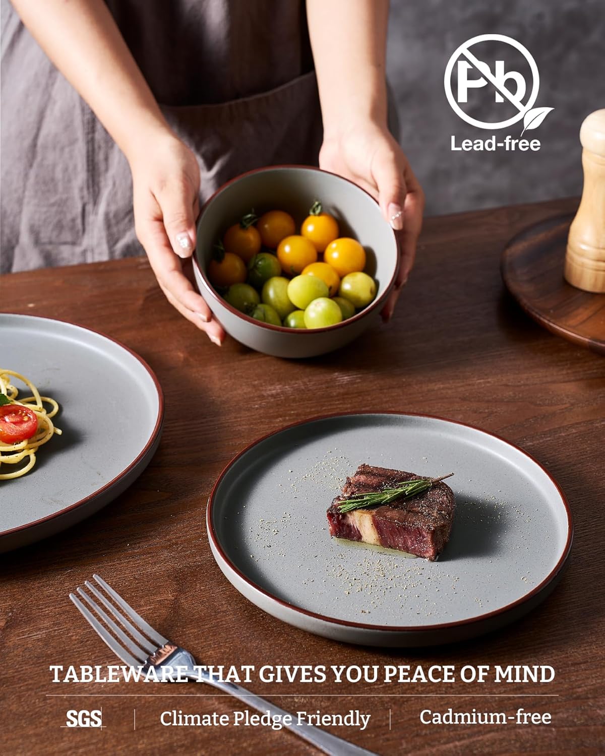- 【FOOD GRADE NATURAL GLAZE】All of our dinnerware sets are made of food grade glaze. You can safely use them to serve steaks, salads or desserts, no need to worry about any harmful substances leaching into the food.