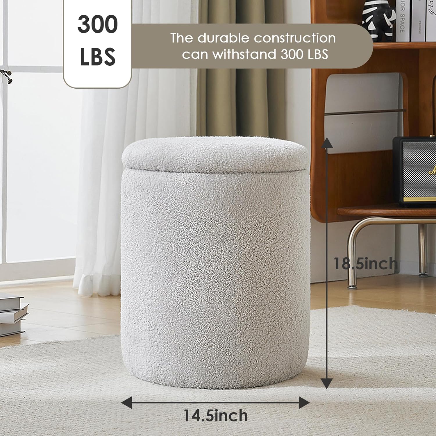 YFO Round Ottoman with Removable Lid Upholstered, Multifunctional Vanity Chairs for Makeup, Soft Footrest Stool Ottoman Foot Stool for Living Room, Bedroom, Boucle, Grey