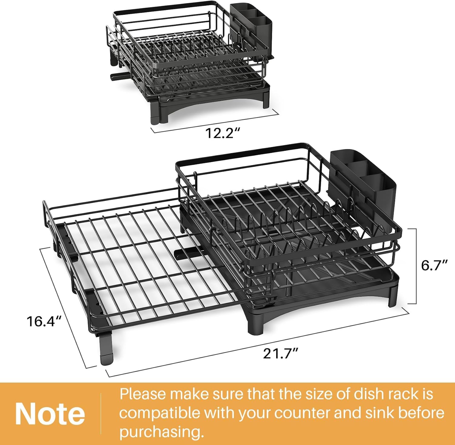- Large Capacity: Dimension: (12.2" to 21.7") Width x 16.4" Depth x 6.7" Height. Equipped with an extendable drying rack that fits over the sink, SNTD's dish drying rack features a 2-in-1 design, doubling the storage space to hold 10 plates, 12 bowls, 6 glasses, 1 pan, and silverware. Just say goodbye to cluttered countertop and enjoy a tidy and organized kitchen.