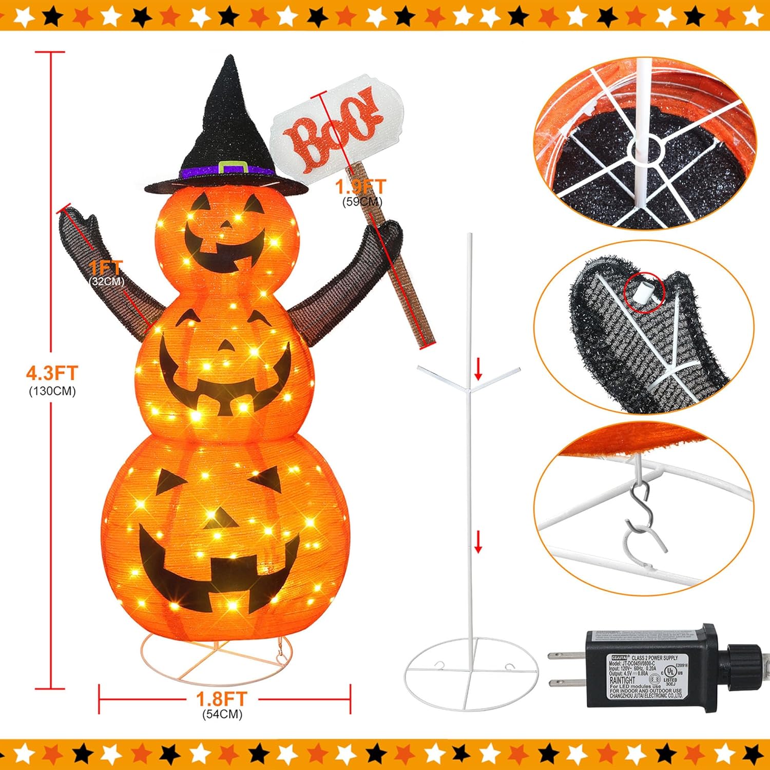 - Package Include: 1 x Collapsible pumpkin(with light), 2 x support poles,1 x ring bottom,4 x ground nails,1 x placard,2 x arms,1 x black cape(DIY cut)οΌ1 x transformer. The installed height is 4.3 Ft(about 1.3 m).