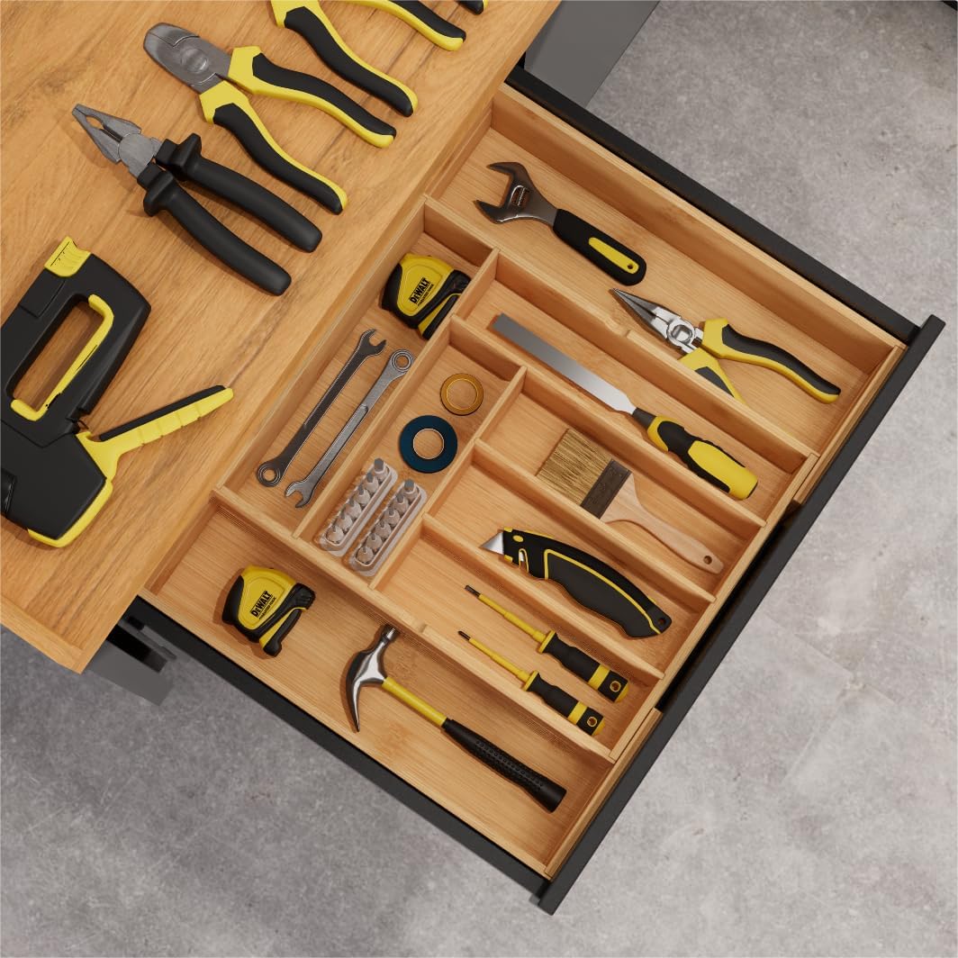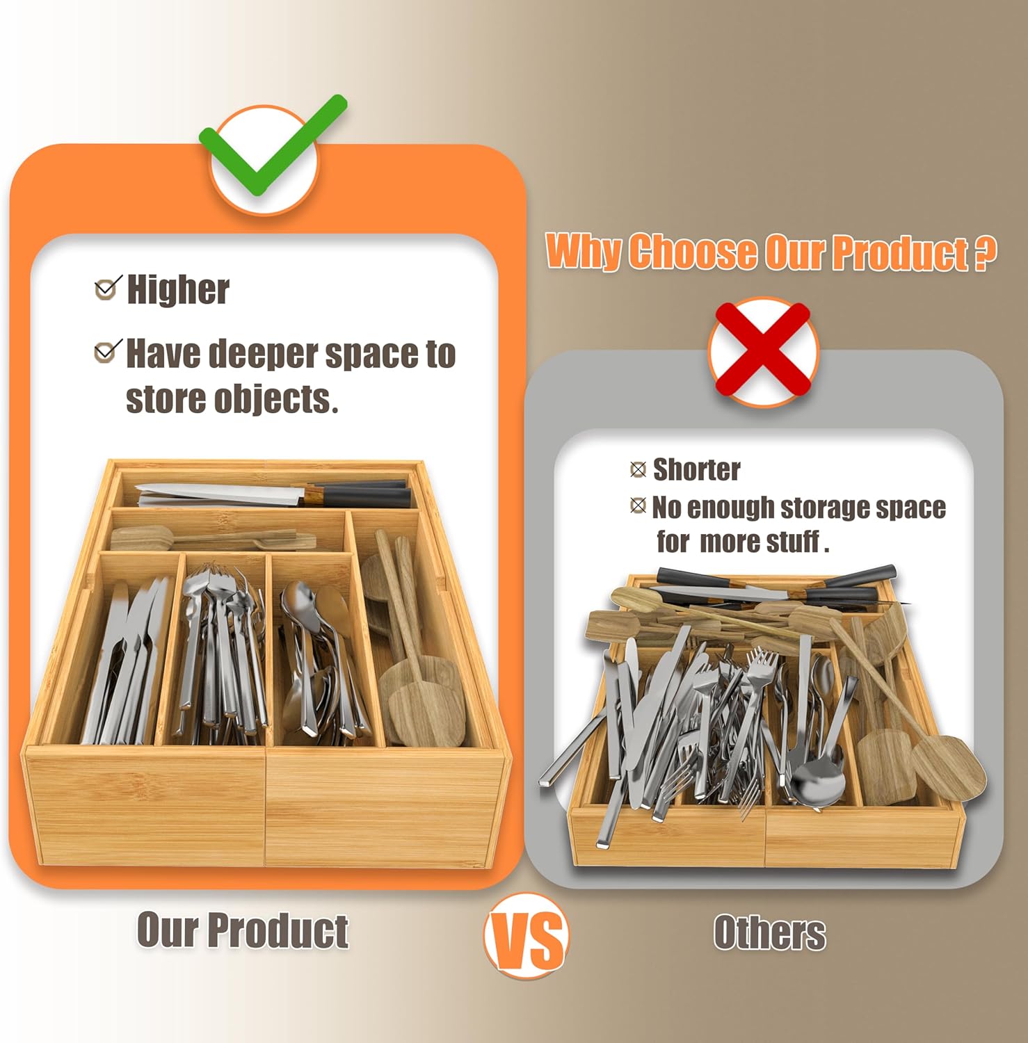 - Premium Tall Design: At 3.9 inches in depth, our bamboo drawer organizer offers greater storage capacity, providing ample space for a variety of utensils, tools, and accessories, ensuring everything stays organized and within easy reach