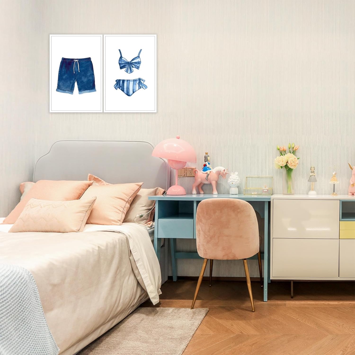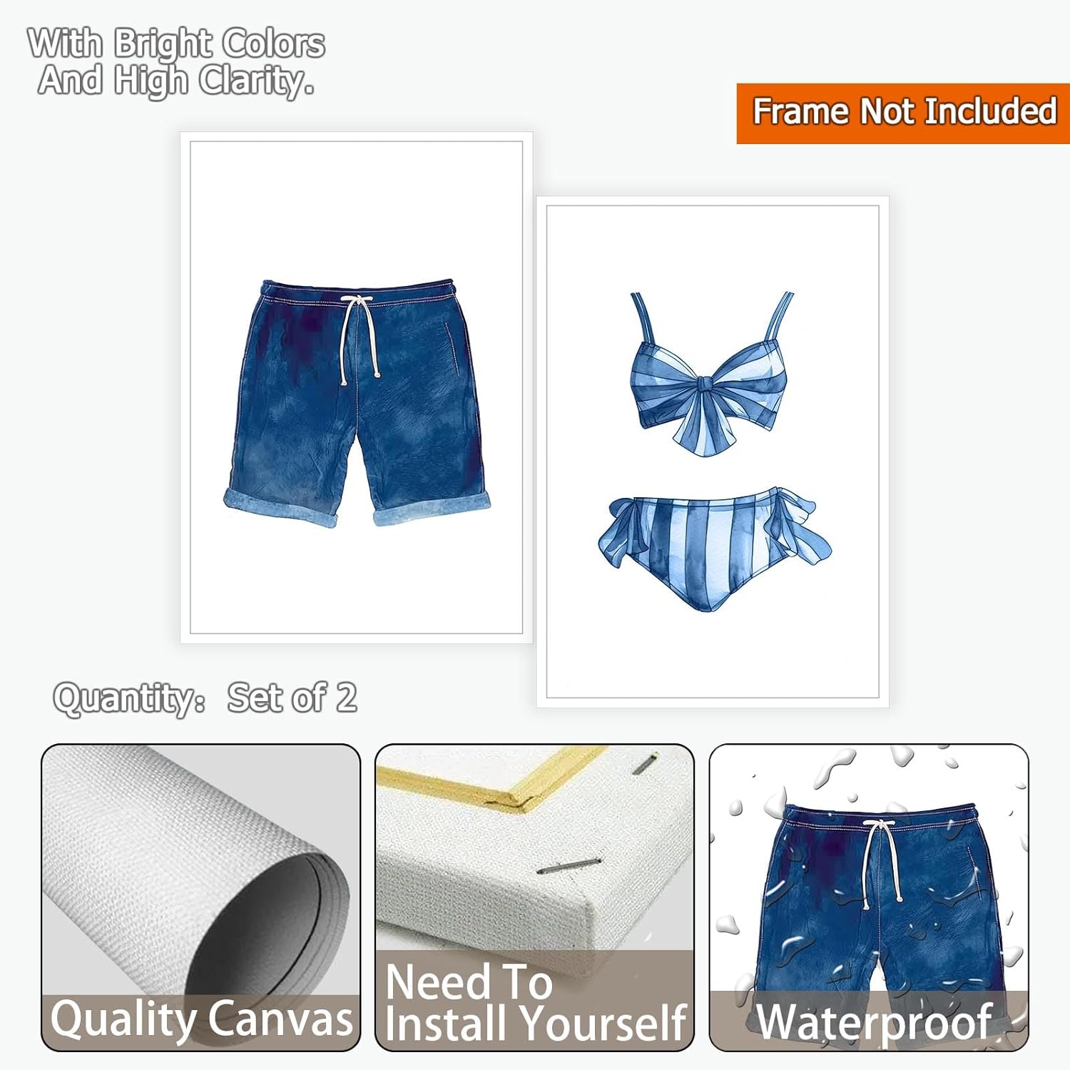 Liyark Set of 2 Retro Navy Blue And White Swimsuit Art Posters Beach Bathing Suit Prints Painting Beach House Wall Art Coastal Wall Decor Pictures For Bathroom Home Decoration 16x24in Unframed