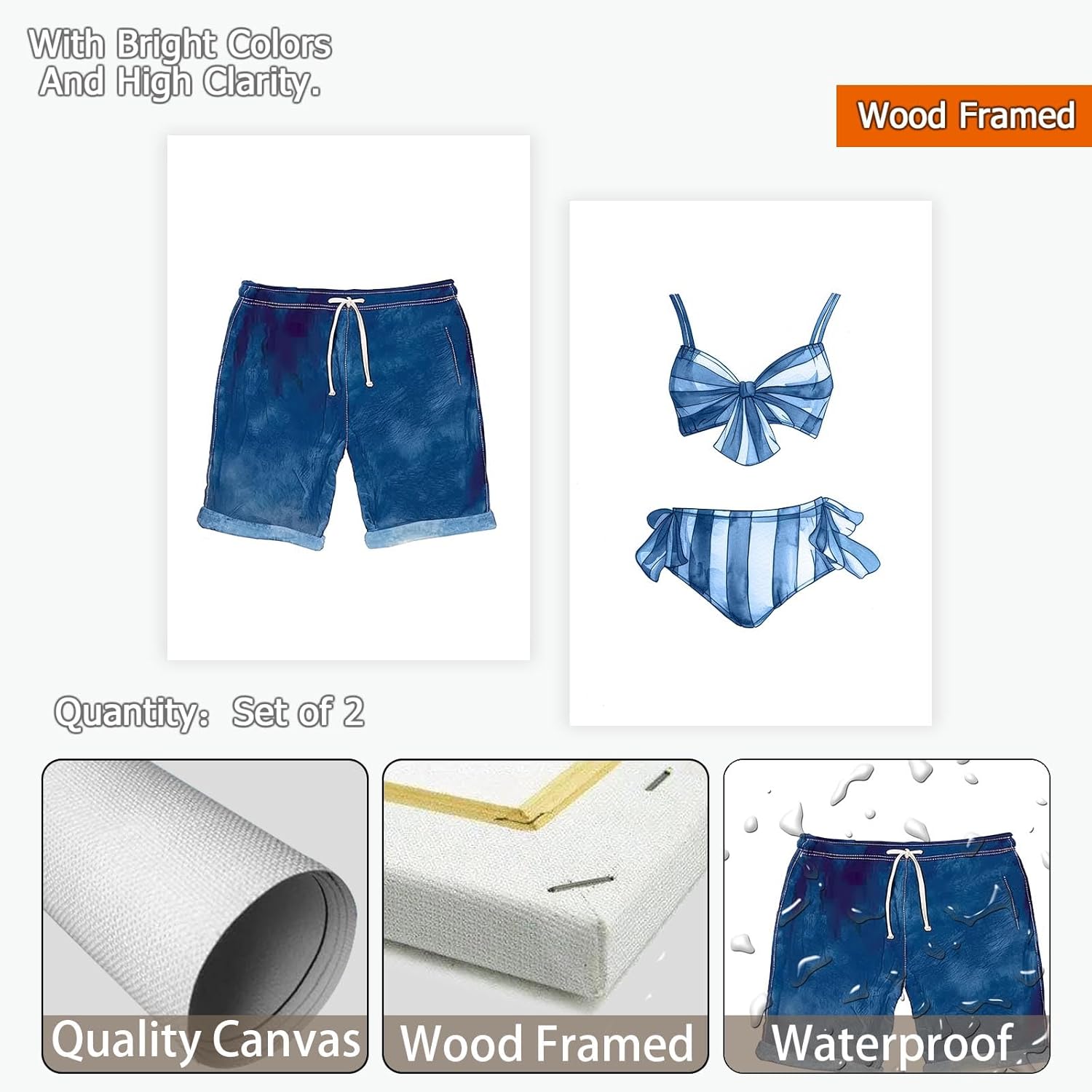 Liyark Set of 2 Retro Navy Blue And White Swimsuit Art Posters Beach Bathing Suit Prints Painting Beach House Wall Art Coastal Wall Decor Pictures For Bathroom Home Decoration 16x24in Framed