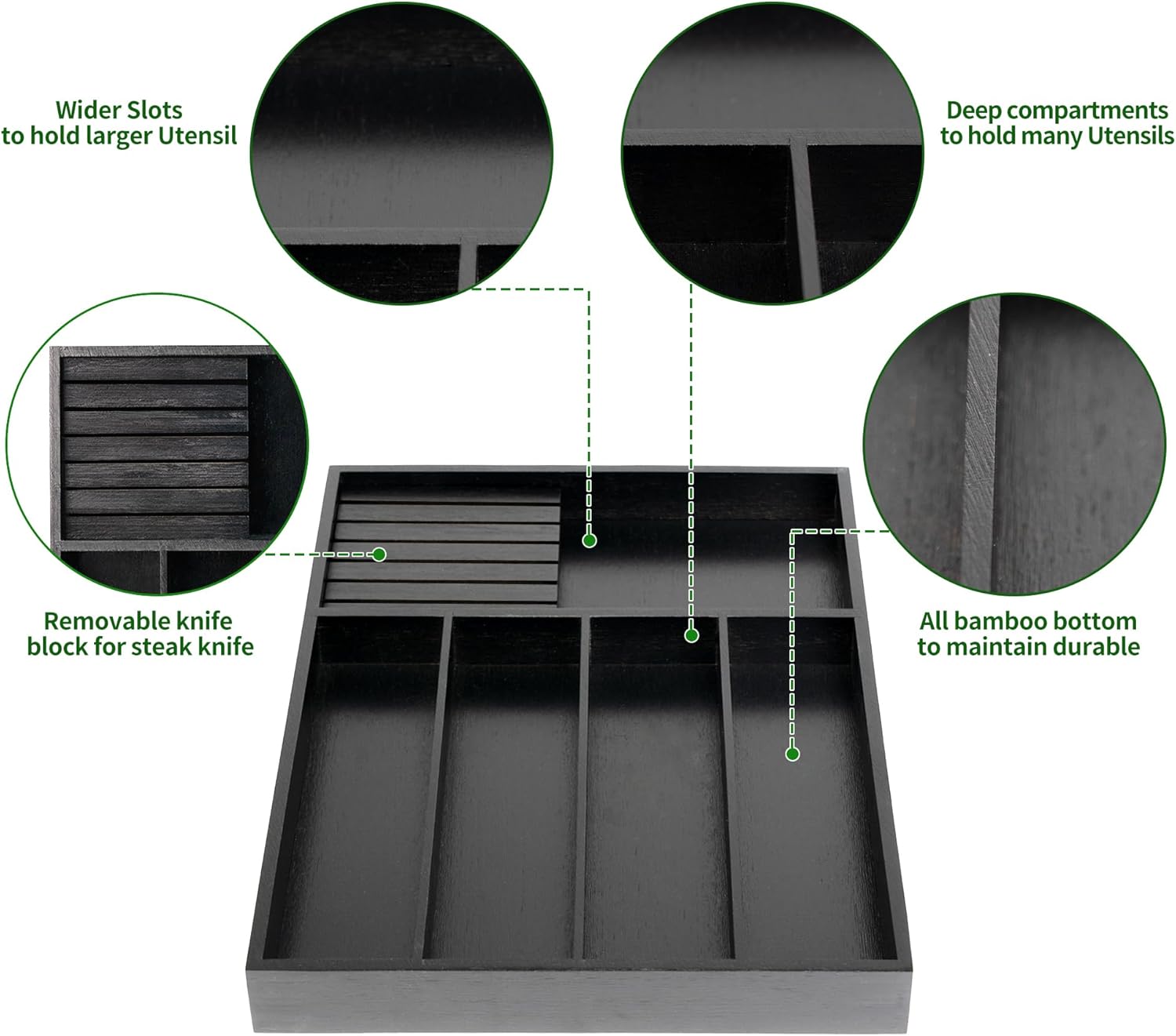 VaeFae Bamboo Silverware Organizer, Utensil Holder for Drawer, Wooden Cutlery Tray with Divider for Kitchen Drawer, Utensil Organizer with Knife Block(Black)
