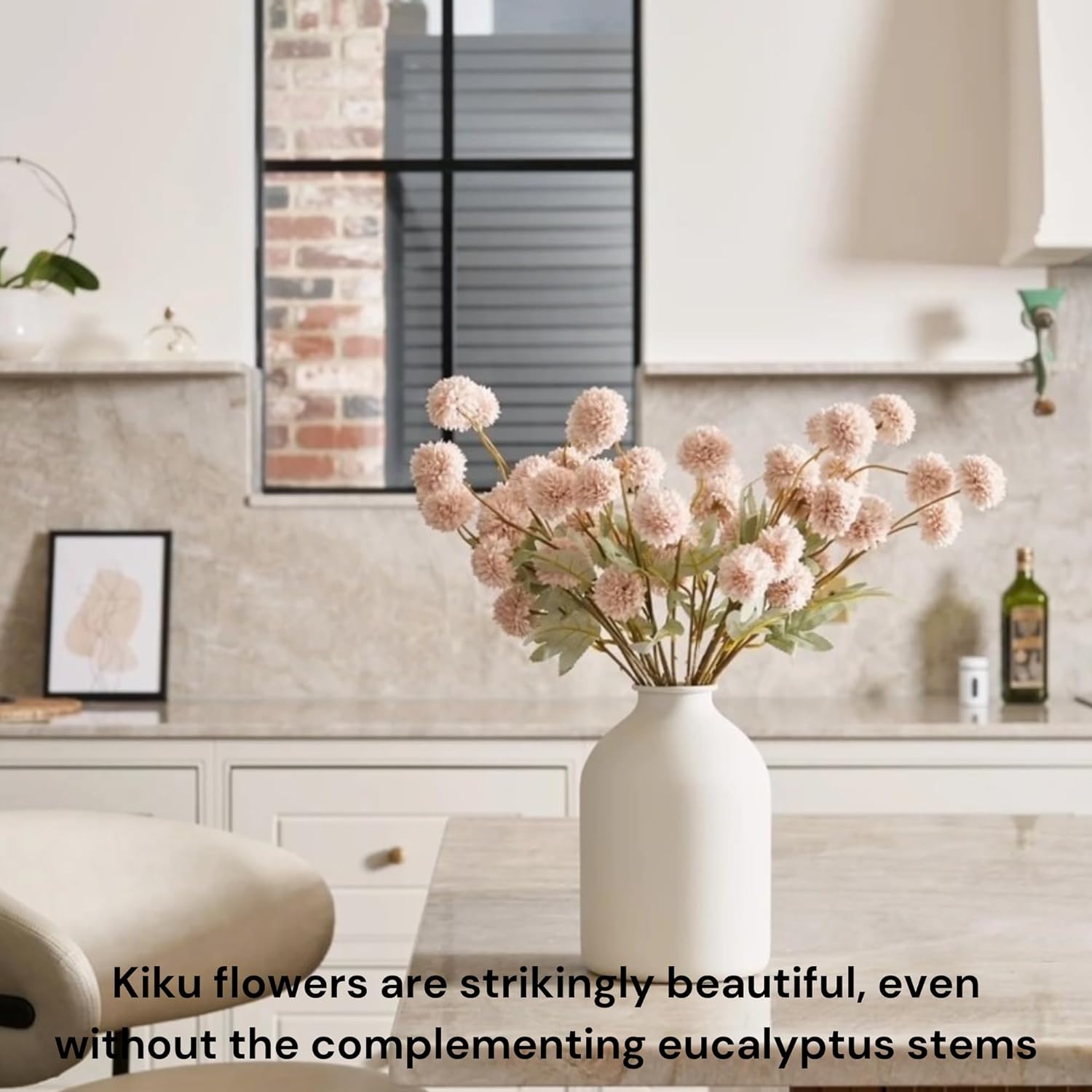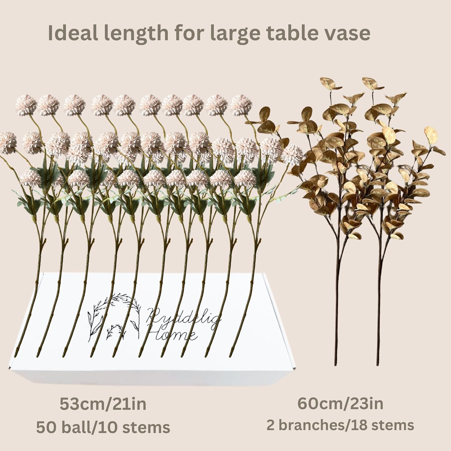 - Silk Flowers with Stems for Beige Decor - Our faux mums flower arrangement in beige complete with 10 tall stems with 50 small mum balls and 18 eucalyptus fake stems is your perfect choice of aesthetic beige home decor. Each of these faux kiku stems measures 53cm/21inches long and the light gold eucalyptus are 60cm/23.6inch tall which makes perfect artificial flower arrangement.