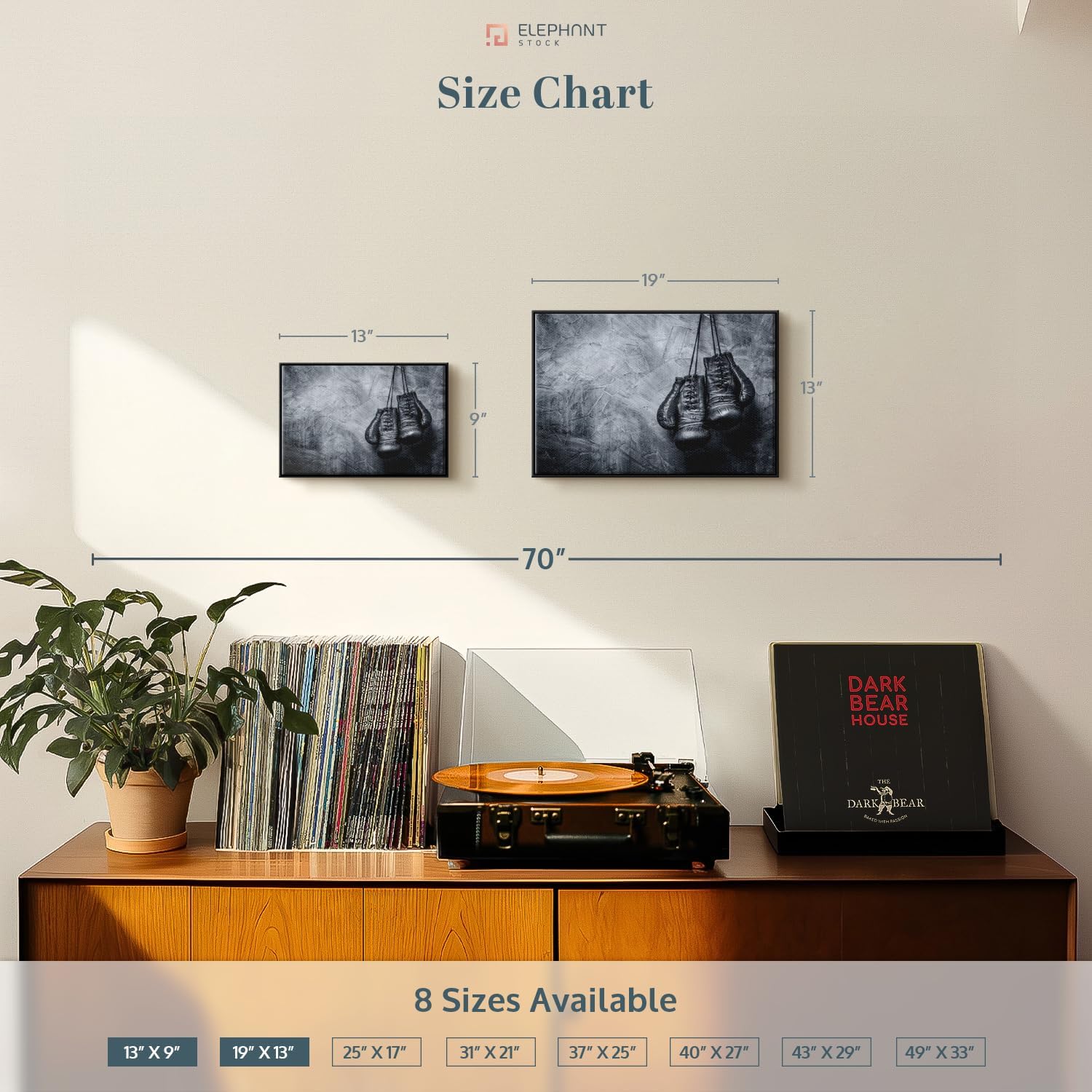 ElephantStock Boxing Gloves Wall Art - Horizontal Framed Canvas - 1-Piece Living Room Wall Decor - Photography Sports Canvas Print - Black and Gray Decor for Wall - 19" X 13"