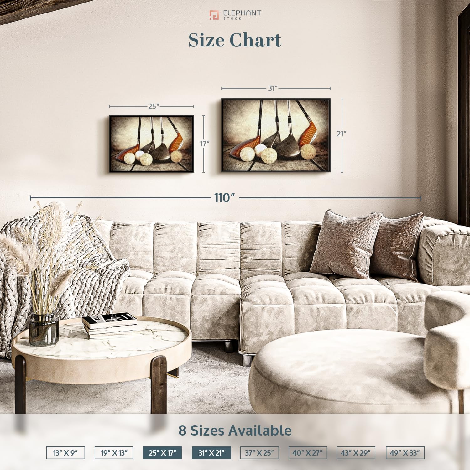 Elephant Stock Golf Sets Wall Art - Horizontal Framed Canvas - 1-Piece Mancave Wall Decor - Photography Sports Canvas Print - Yellow and Brown Decor for Wall - 25" X 17"