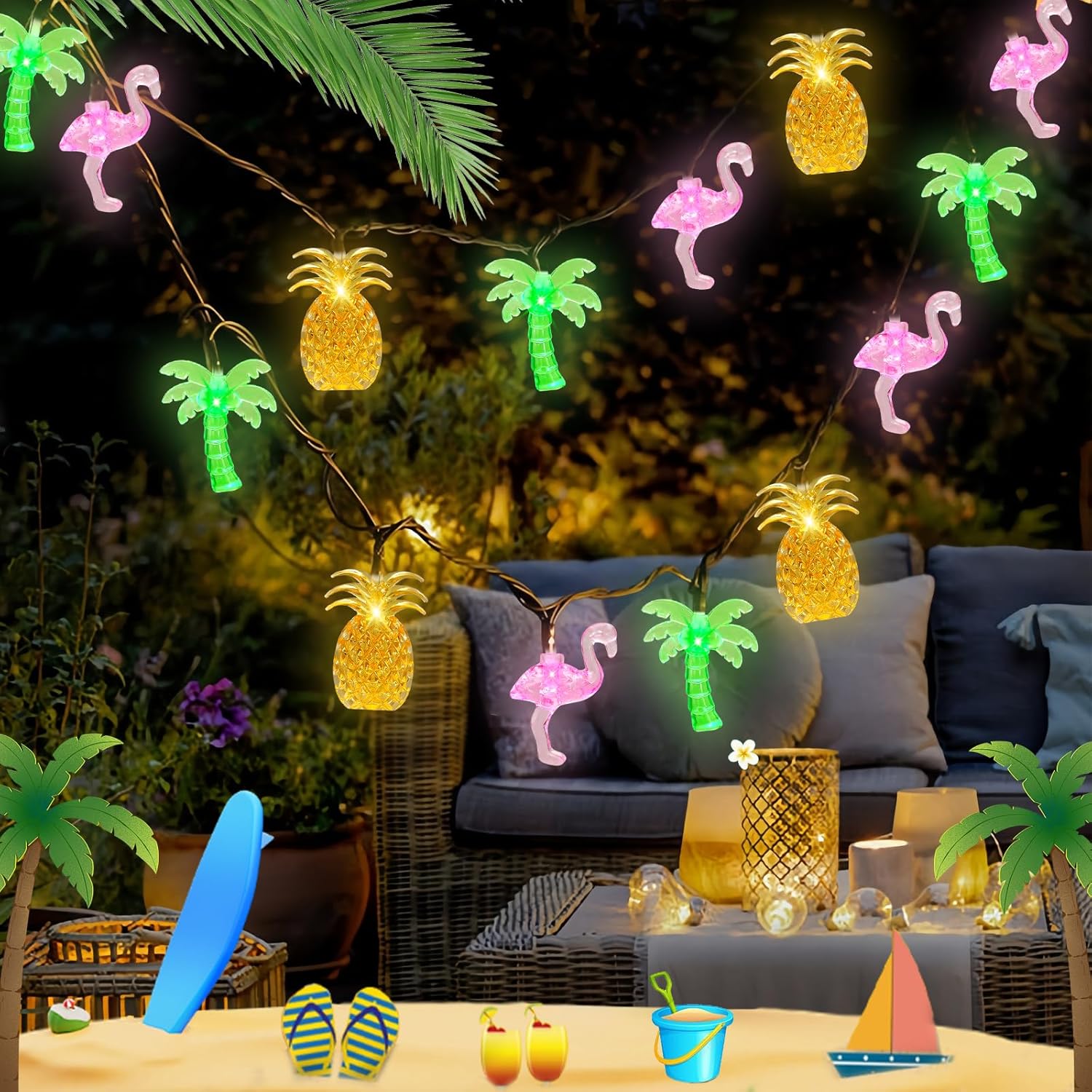 - 🍉Great Summer Gift: Hawaiian Tropical String Lights have a nice soft glow,look warm and bright. These are ideal for adding a cozy atmosphere. Flamingo pineapple palm tree set off at night even more cute, delicate, harmonious. These summer decorations evoke the essence of the season.