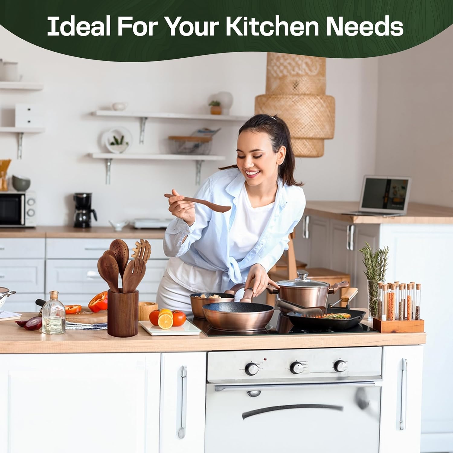 - [Exclusive Combination]- Introducing our wooden utensil set which includes a Wooden Utensil Holder, practical spoon rest to safeguard countertops from cooking fluids, four hanging hooks and eight spoons of different kinds