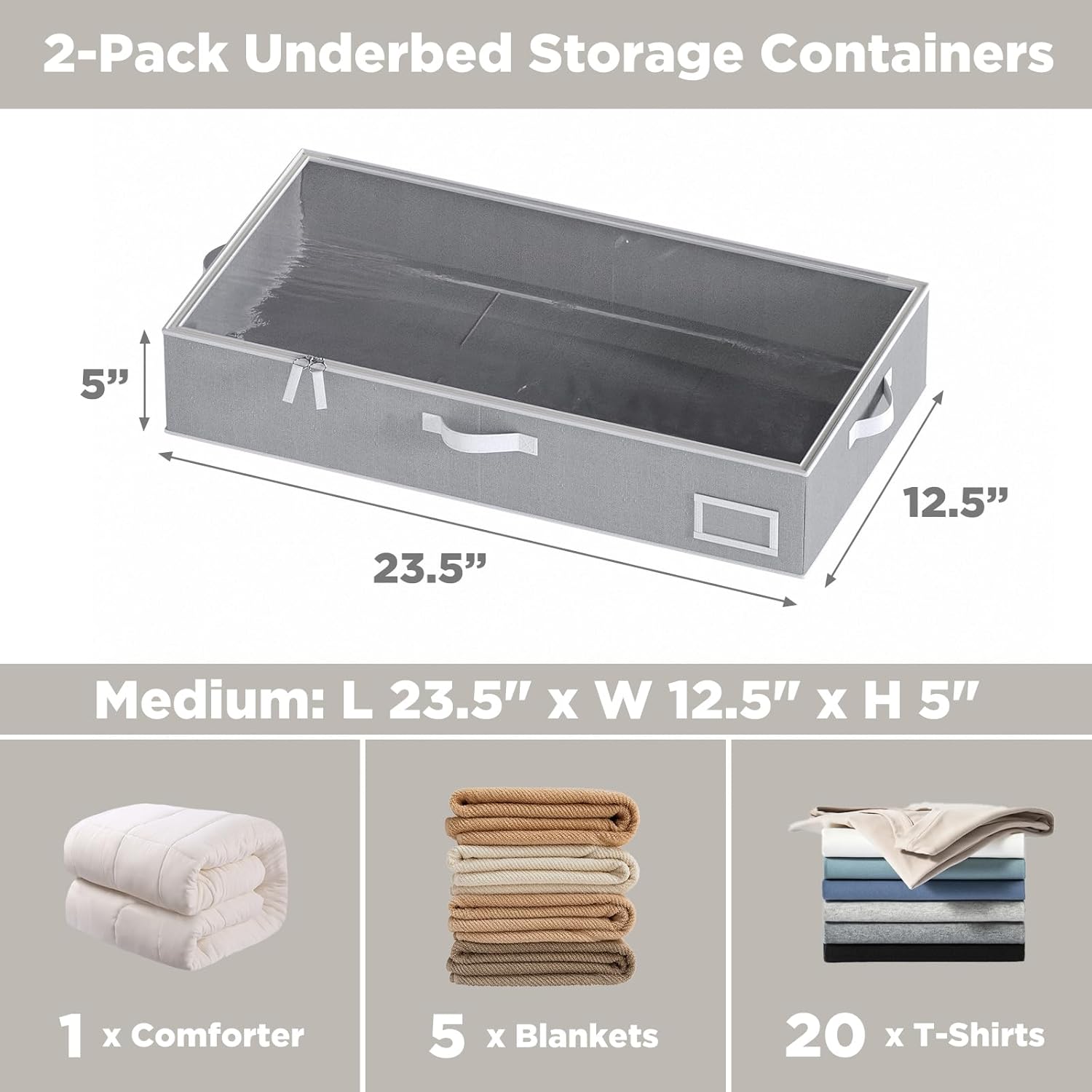 Under Bed Storage Containers, 2-Pack Underbed Storage Box, Collapsible Clothes Storage Bins with Handles and Lid, Large Under Bed Organizers for Shoe, Blanket, Toy, Pillow, Sheet, Gray