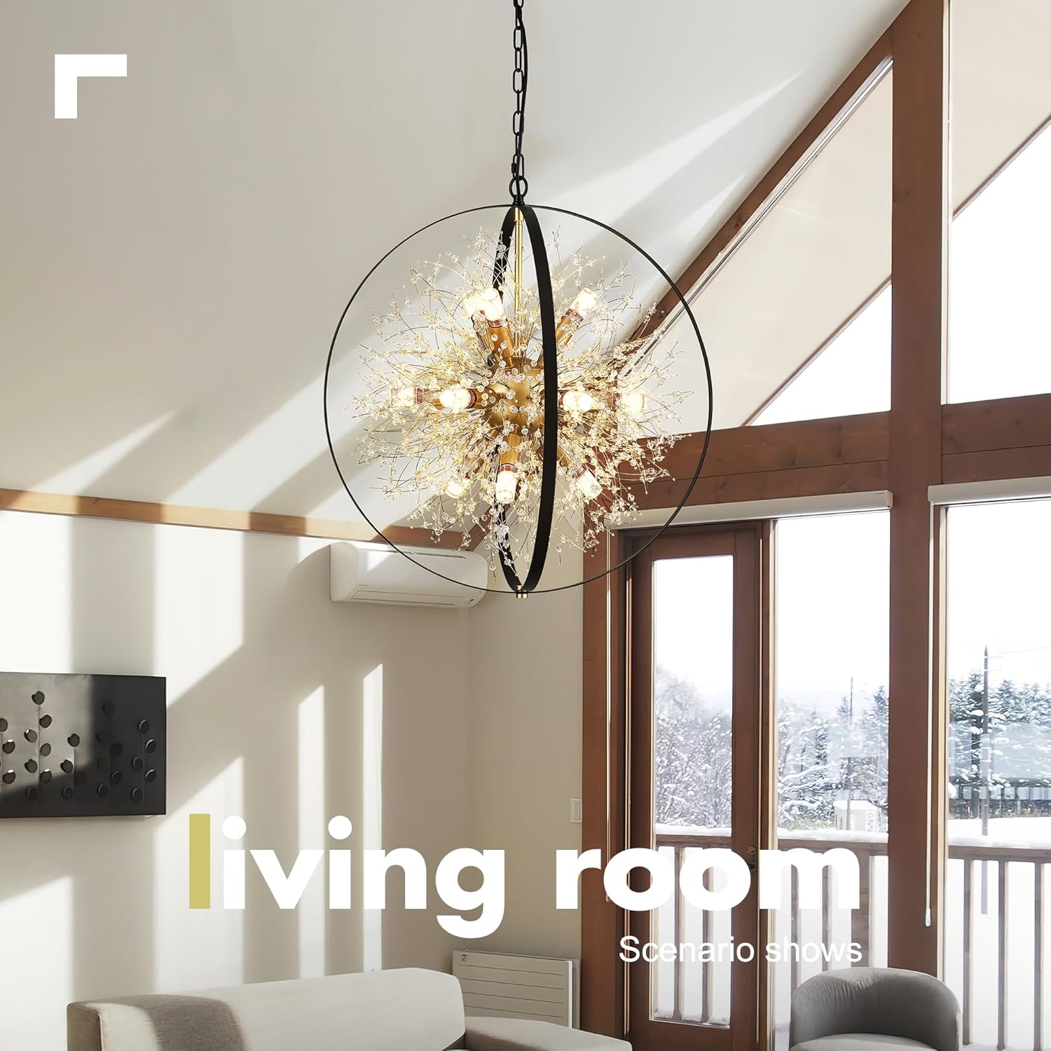 Modern Crystal Chandeliers Firework, 23.2'' Black Gold 12-Light Globe Dandelion Sputnik Chandelier, Hanging Pendant Lighting Fixture for Dining Room, Bedroom, Kitchen, Entryway, Foyer