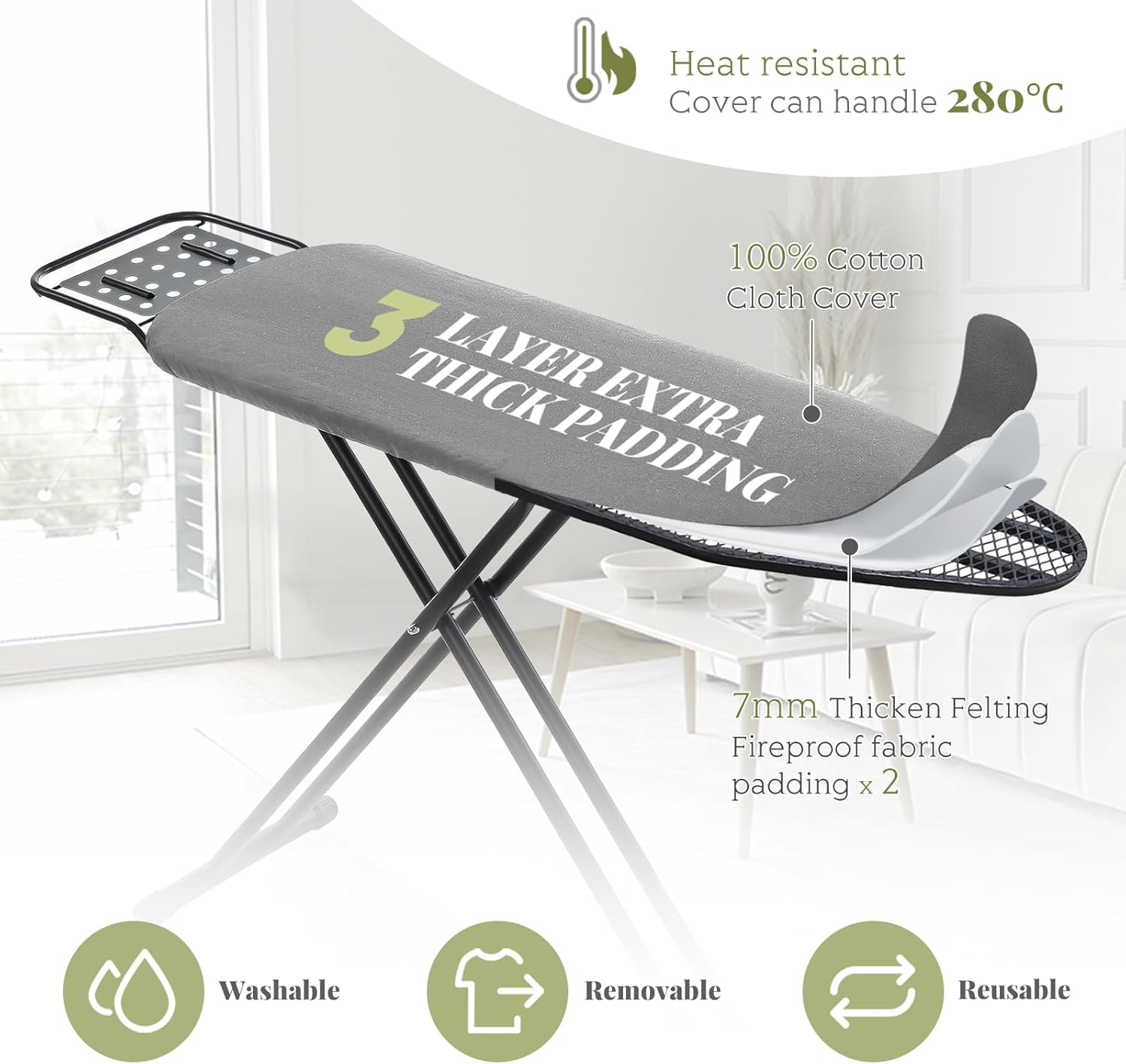 - Iron Board Cover with Padding: The ironing board cover is made of 100% cotton; It's removable, washable, and reusable, and it comes with 2 layers of 7 mm thick pads made of fireproof fabric; The extra thick cloth cover ensures you an extraordinary ironing experience