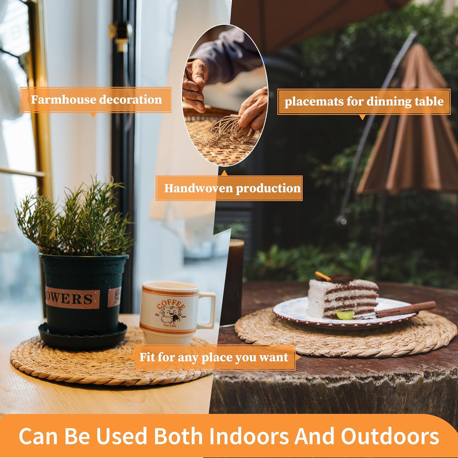 - 【Natural Design&Handcrafted】: Woven Placemats feature a sturdy woven design and round silhouette, This Round Placemats have very tight woven cattail grass (water hyacinth)design and well sewn placemats are carefully handcrafted and made of natural 100% water hyacinth, Easy Cleaning: Simply clean with damp cloth then store in a dry place.