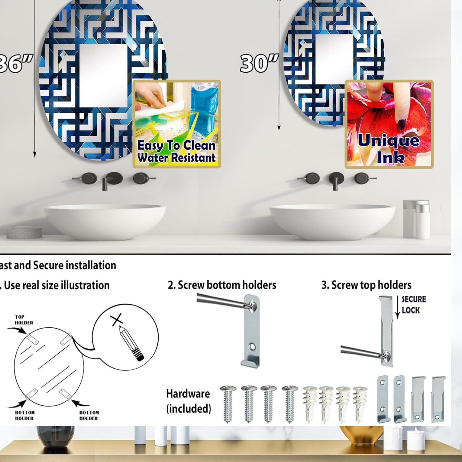 Symmetric Cubes in Deep Cobalt Blue - Geometric Maze - 24x36 Inches - Oval Decorative Wall Mirror for Bathroom, Bedroom, Entryway, Living Room, Vanity Room and Modern Décor