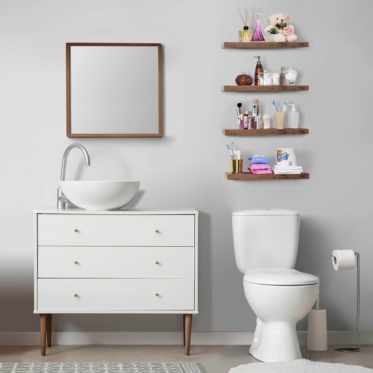 - Versatile & Functional Floating Wall Shelves: Install these floating shelves in the bedroom or bathroom to hold beauty/hair products - Place your wall shelf under a mirror in the entryway or exhibit family photos gallery style in a long hallway - Use as bathroom shelf, book shelf for wall, wall decor for bedroom, over the toilet shelf, kitchen floating shelves, floating nightstand, kitchen decor, living room wall decor, display shelf, and more