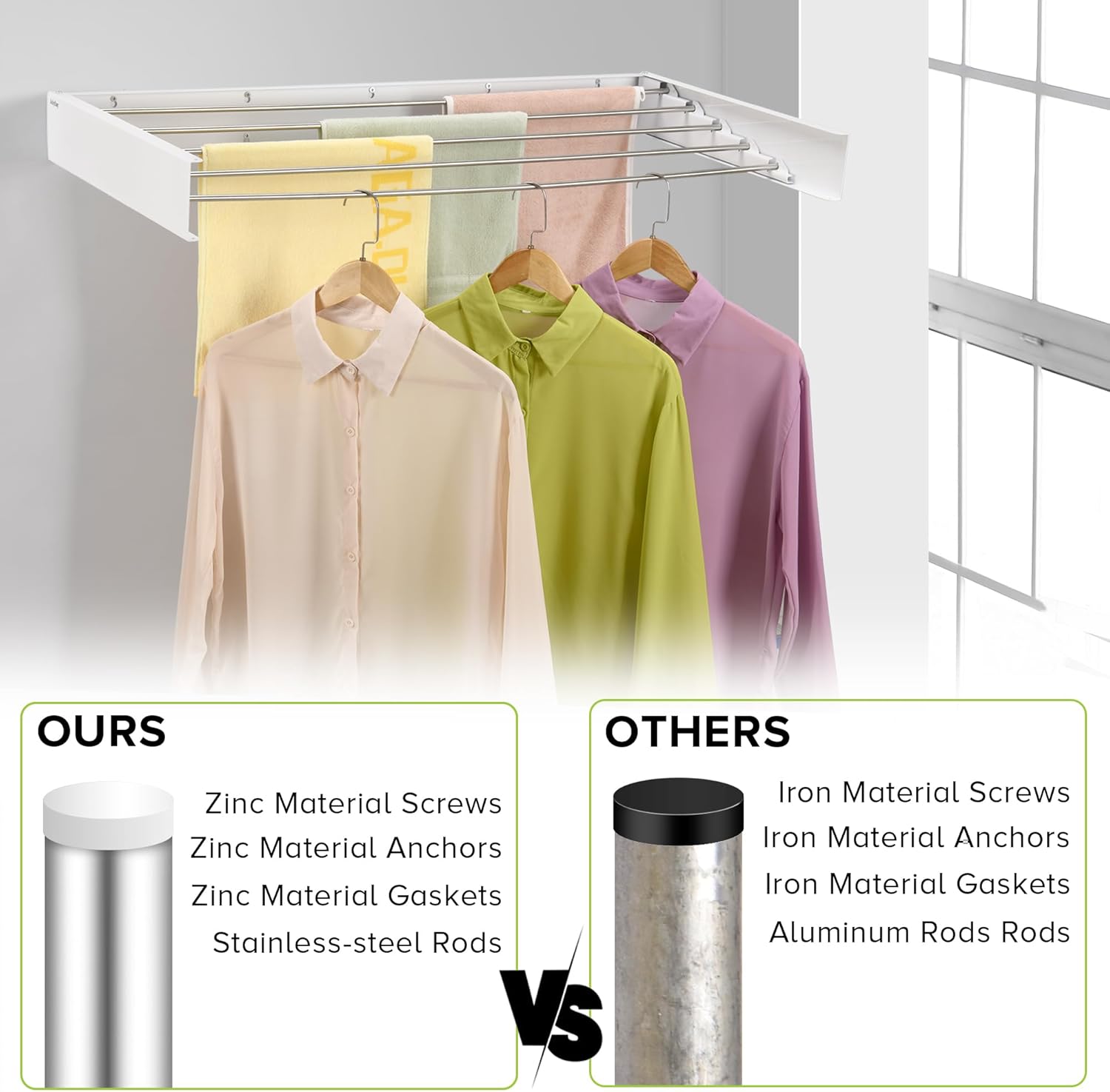 Wall Mounted Laundry Drying Rack, Retractable Clothes Drying Rack for Bathroom with Wall Template, 5 Stainless Rods Heaving 60 lb Capacity (White, 40")