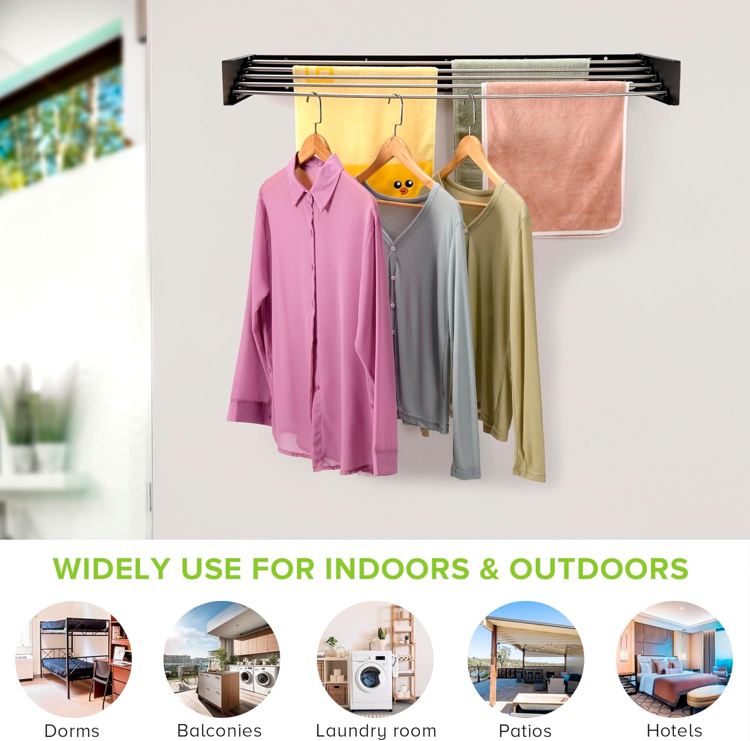 Wall Mounted Laundry Drying Rack, Retractable Clothes Drying Rack for Bathroom with Wall Template, 5 Stainless Rods Heaving 60 lb Capacity (Black, 40")