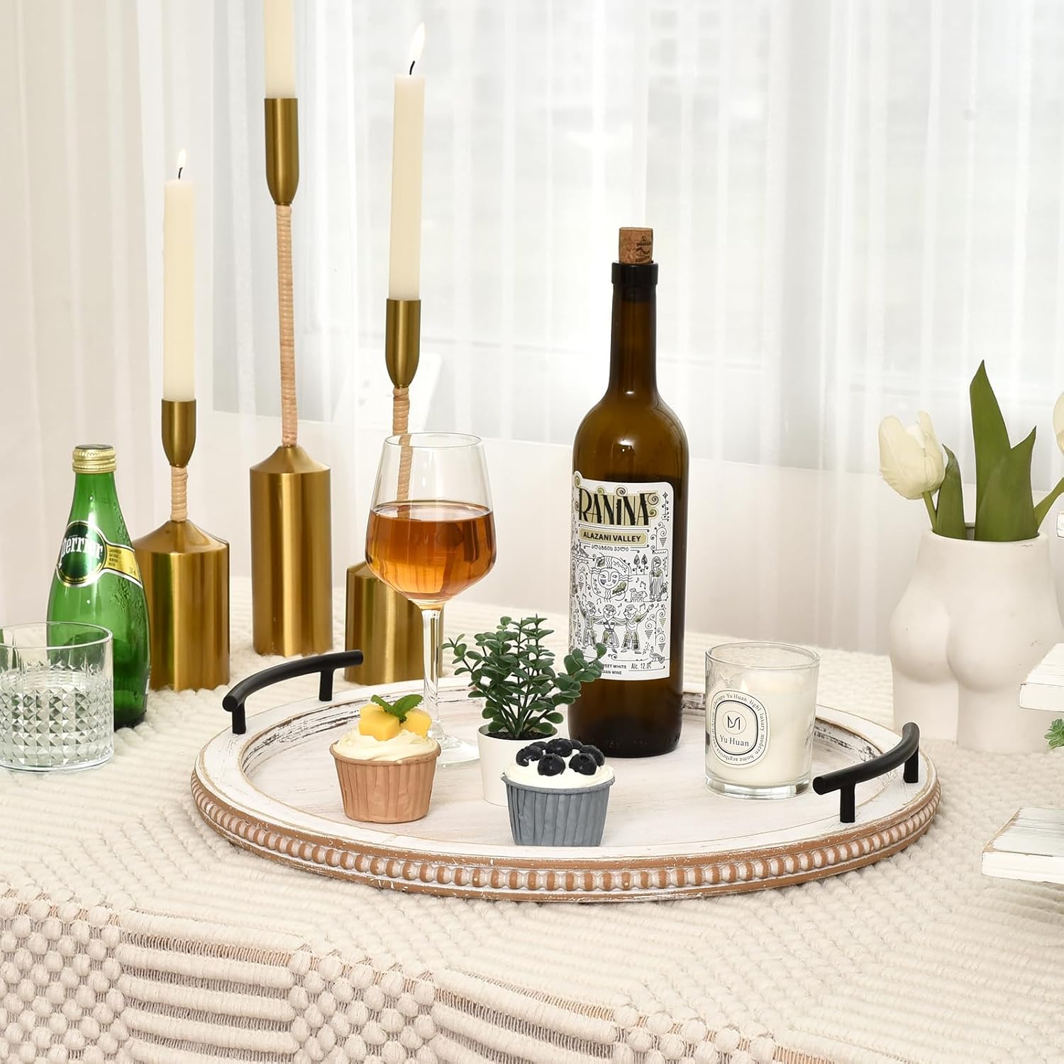 SwallowLiving 18Inch White Wooden Beaded Serving Tray with Handle Decorative Rustic Whitewashed Tray for Coffee Table Farmhouse Round Tray for Kitchen, Living Room and Bedroom