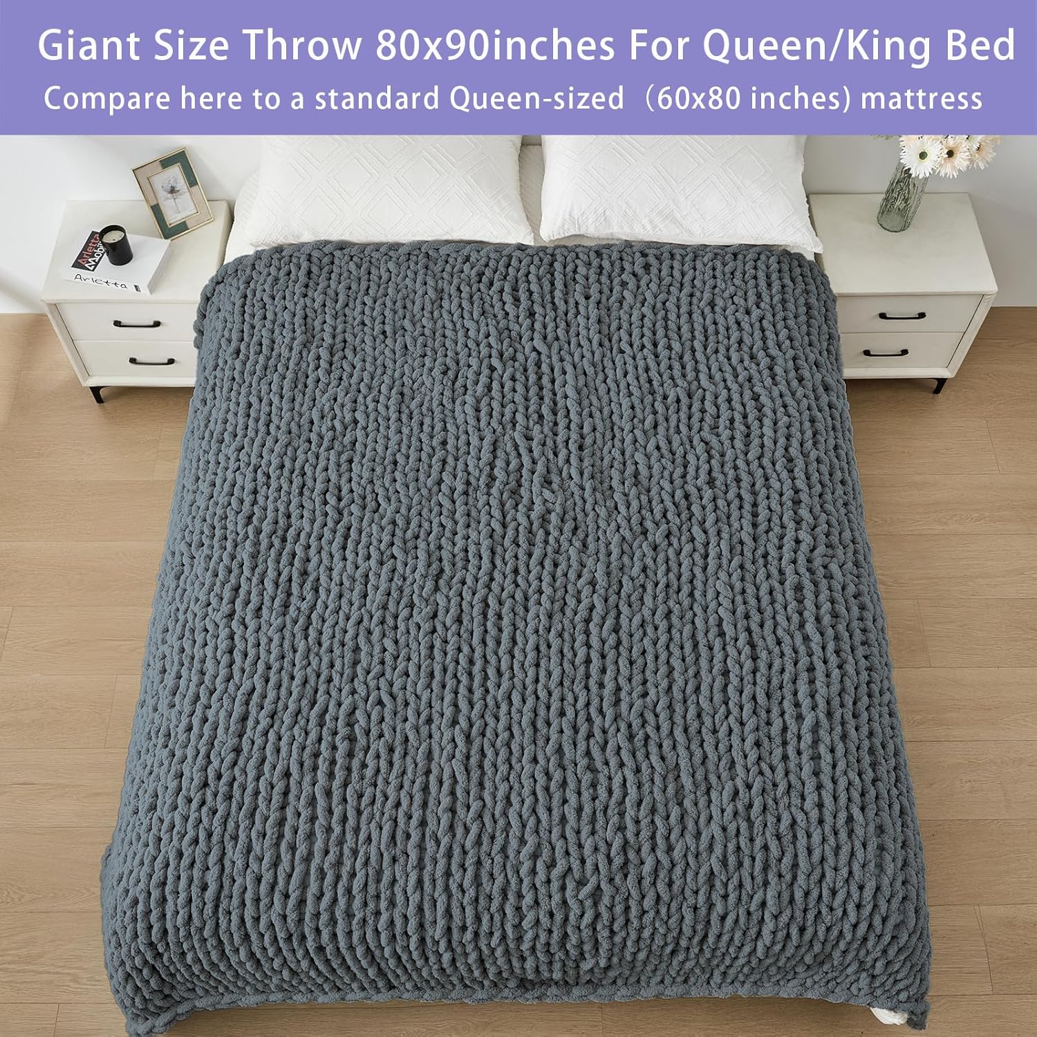 Bigacogo Chunky Knit Throw Blanket for Couch, 80x90 inches, 100% Hand Knitted with Thick Jumbo Chenille Yarn, Cozy Soft Large Rope Knot Cable Crochet Blankets for Sofa Bed Living Room, Iron Gray