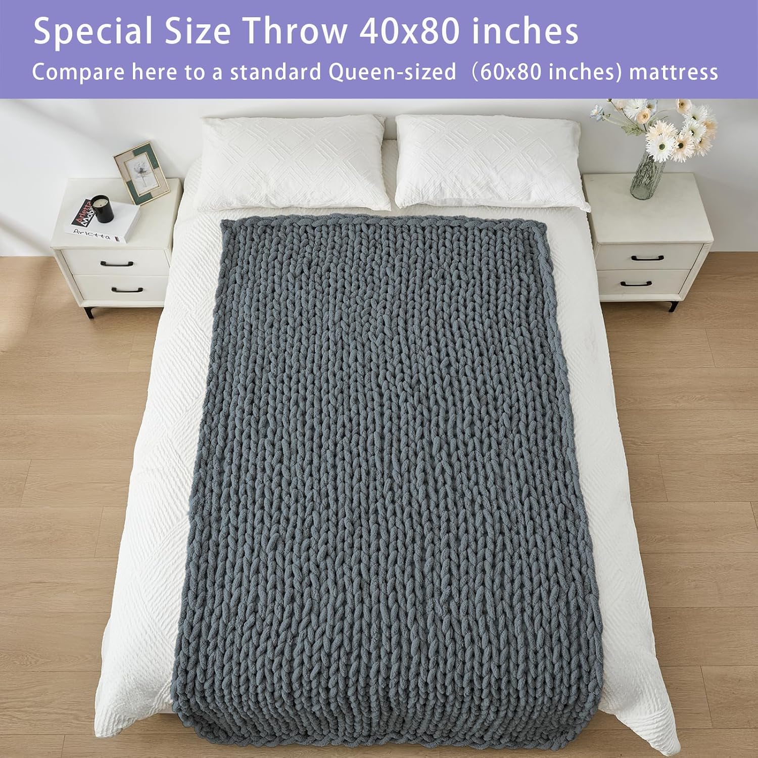 Bigacogo Chunky Knit Throw Blanket for Couch, 40x80 inches, 100% Hand Knitted with Thick Jumbo Chenille Yarn, Cozy Soft Large Rope Knot Cable Crochet Blankets for Sofa Bed Living Room, Iron Gray