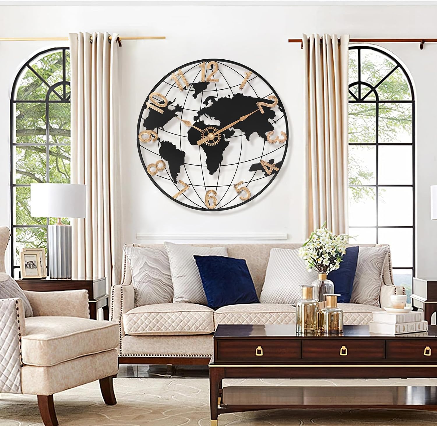- 【Primary Focus of The Living Room】 Pytha Sight 24 inch world maps wall clock is a stunning piece,sure to captivate your guests:It fits perfectly above fireplaces,and the vintage gold arabic numerals with exclusive customized gear pointers help you read the numbers more:Our beautiful oversized wall clock complements your living room decor,adding an elegant touch to your home:With its impressive large wall clock 24 inches or larger,this big wall clock is a perfect size for any room, and it has become a conversation starter whenever guests visit.