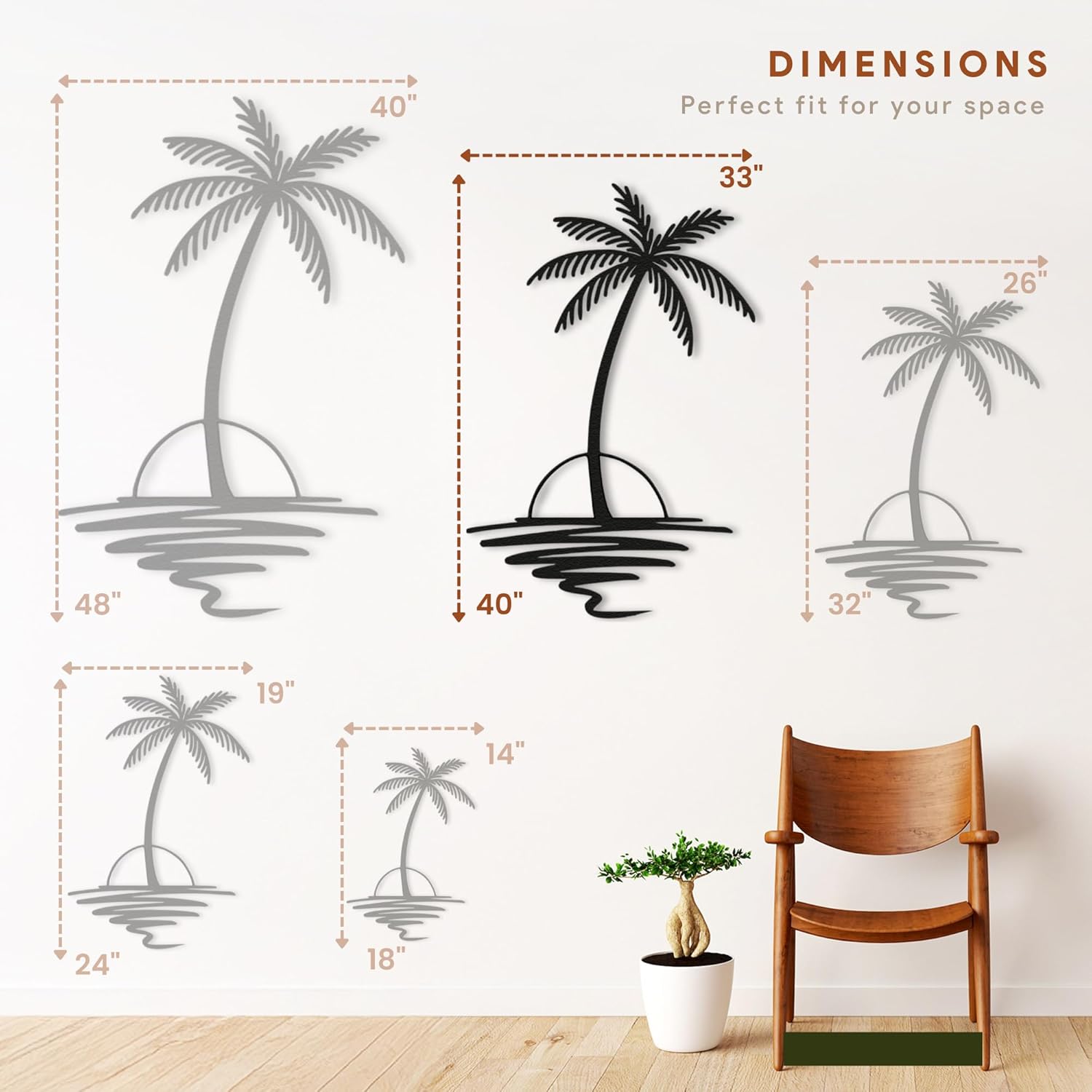 - HIGH-QUALITY METAL DESIGN WITH SUNSET PALM TREE: Expertly crafted from durable and long-lasting high-quality metal, this modern wall art showcases a captivating tropical scene with a sunset and palm tree. Perfect for enhancing the aesthetic appeal of both indoor and outdoor spaces, it adds a touch of exotic elegance and vibrant charm to your home decor. The intricate details and vivid colors of the sunset and palm tree create a relaxing and inviting atmosphere, making it an ideal addition to any living room, bedroom, garden, or patio.