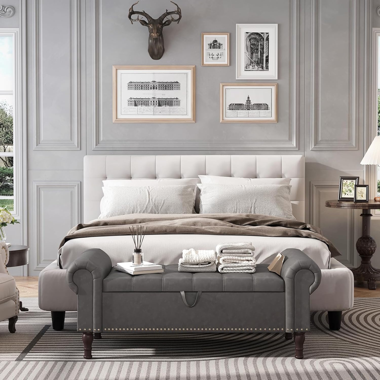- 【ROLLED ARM & VINTAGE RIVETS】This bed bench blends Rolled Arm with Vintage Rivets, capturing the essence of a truly vintage piece. The button-tufted stitching on the lid enhances design of this end of bed bench. Simple lines provides a truly appealing look,feel and design. Perfect into a variety of styles of home scene.