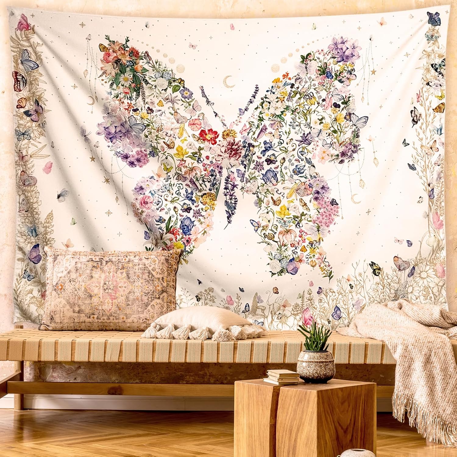Damanse Butterfly Tapestry Wall Hanging Cute,Boho Wall Tapestry for Bedroom Aesthetic,Flower Living Room Decor for Teen Girls (White, 59.80" x 78.70")