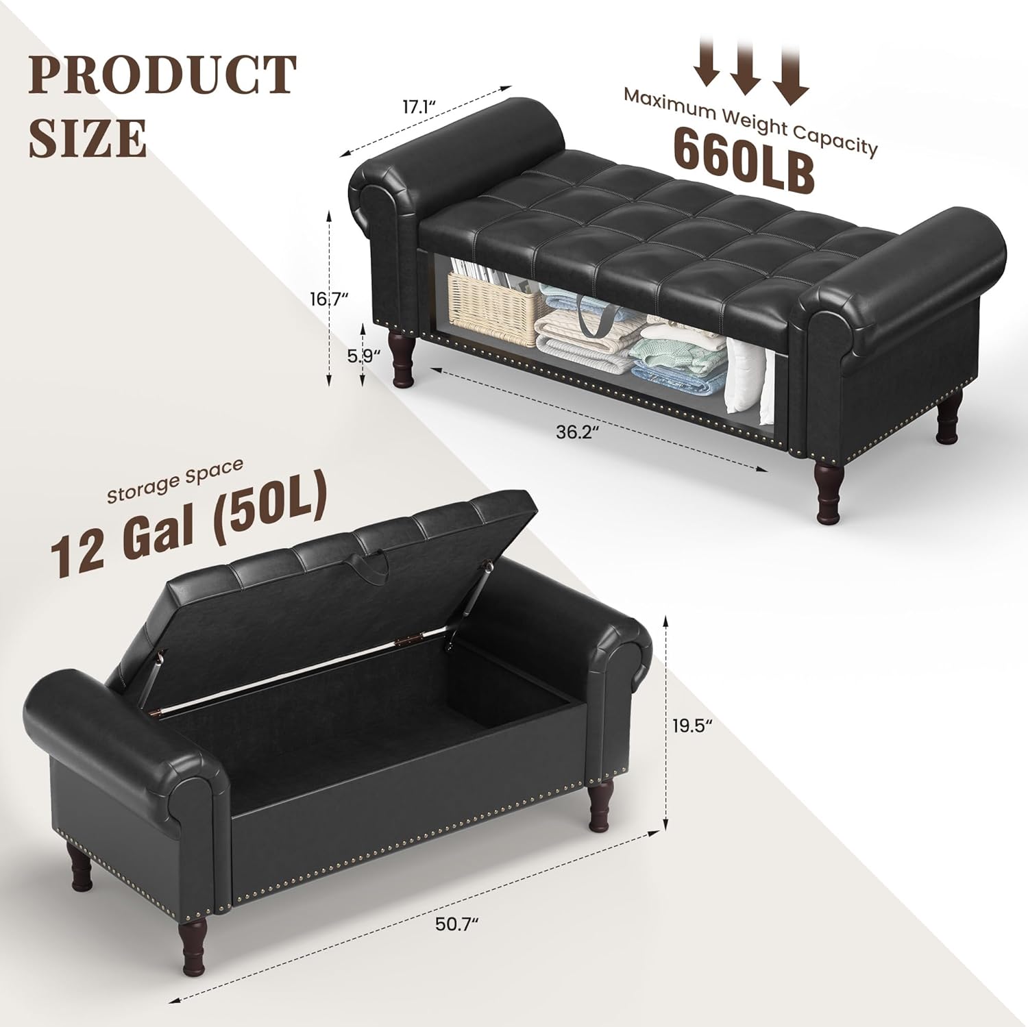 - ăEXTRA-LARGE STORAGE SPACEăThe dimensions of the storage bench are 50.7" * 17.1" * 19.5" inches, suitable for beds of all sizes, especially for FULL / QUEEN size, placed at the end of the bed, providing 12 gallons (50L) of storage space for blankets, pillows, seasonal clothing, books, and more.